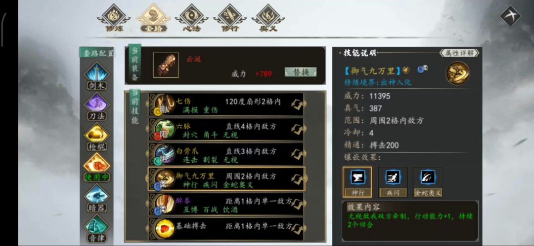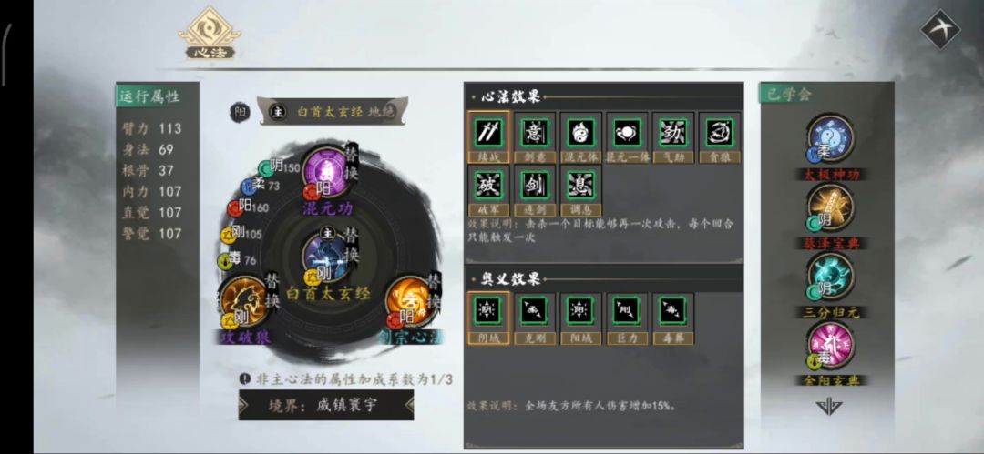 属于之前我提出的《无限成长流》的分支流派,选用了内功中心法效果为字体的五个文字:【意】【劲】【破】【剑】【息】。实际测试下来,虽然只有一回合连斩,而且反击率很低,而且【息】的调息值只能作用《分天剑谱》中的四个剑招。所以比较受限,强度一般。像我用惯了反击和连斩的人,的确会感觉清场效率不是很高,但是因为五个文字都是成长性心法效果,所以后面越来越强,无论招式威力还是烫血伤害都很直观。所以属于成长流中的分支纯文字流。
