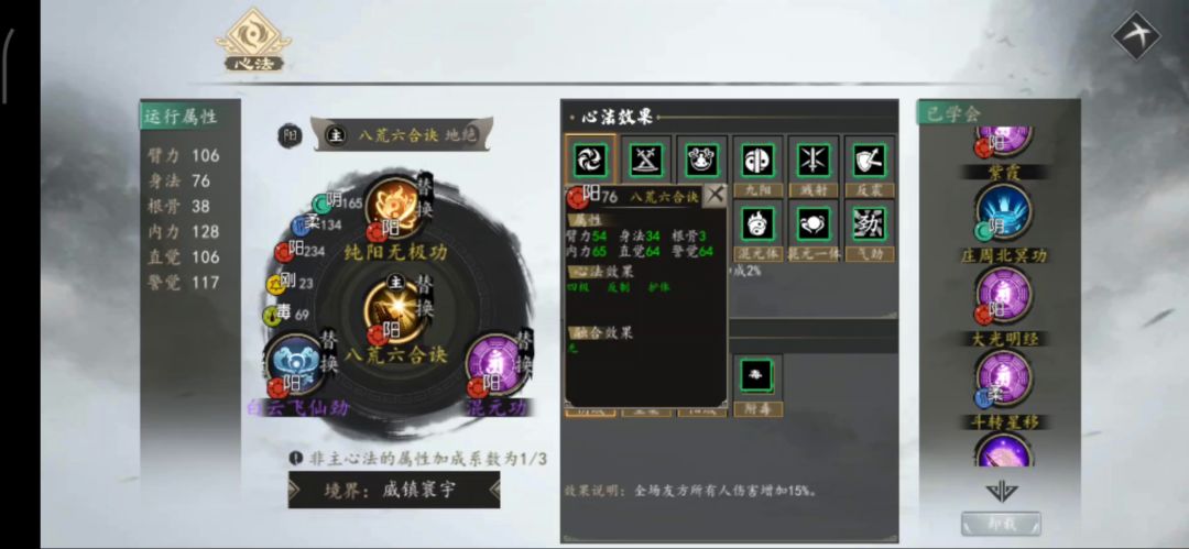 极限搭配出四域(阴阳柔毒每系150+,我动态有具体搭配),优化了一下,《九阳》替换为《八荒六合绝》,《易筋经》替换为《万象森罗》。其他不变。这套除了没连斩,其他都是接近完美了,连斩可以学对方有连续或者连战的招式,我运气不好没学到。 自建门派线可以说是游戏我个人认为强度最高,因为要打朝廷日厂战(四连战),正道武林战(车轮战1),魔教江湖战(车轮战2),可以说把基本势力全部囊括了,而且自建门派线很多秘籍拿不到,不过作为补充有《万象森罗》,《不坏金身》和《玄武真功》二选一。看来后期官方都是发防御性功体可以看出来,站桩的必要,毕竟消耗还是很大的,无论是异常状态对策,内功强度,招式配比等都对玩家有一定要求。不过看过我之前一回合清场,两回合清场的大侠也知道有些搭配可以达成速清,这次就带来正常的清场站桩虐菜流程了,仅供娱乐。