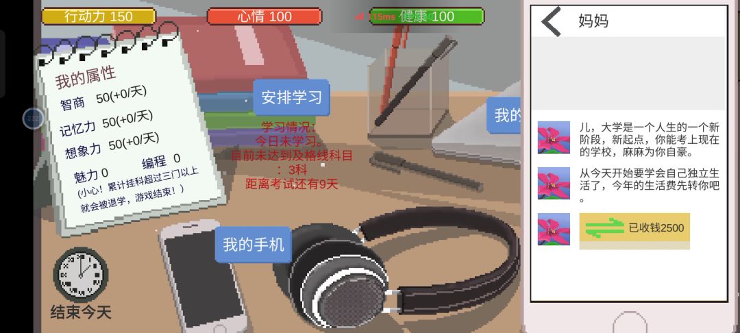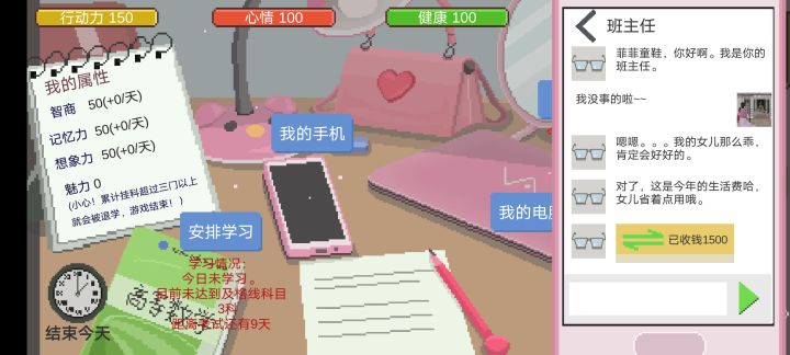 菲菲好难啊,花钱又多还动不动就心情健康值不好,基本上明天早上醒来就先扣50体力再说,本来体力就不多还有学生会的事要处理,还要保证不挂科