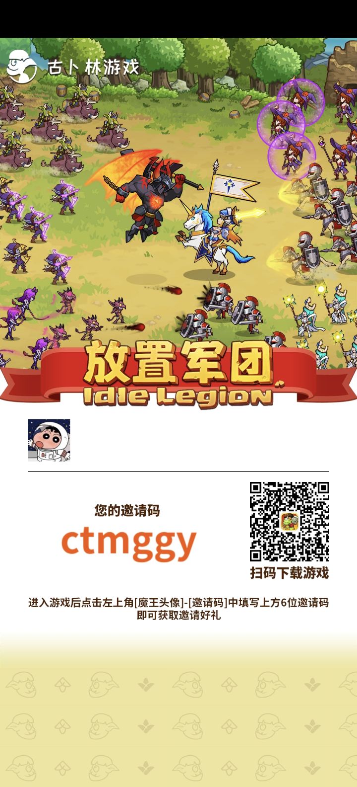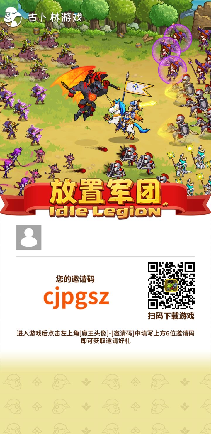 我的邀请码: ejcgjg(领1000氪晶 ) 加好友,我能领到1个工人,后期还能来我这卖高价特产,大家互惠互助,(点左上角头像,输入邀请码) 注意:抽卡存到120再抽 ,可以多拿一个A级军团 兑换码如下: 1.放置军团 666(200氪晶) 2.FZJT666 (10000魔晶) 3.可靠的布道者(500氪晶) 4.头秃古卜林们 (20000魔晶) 5.我会回来的啊(两瓶盖) #