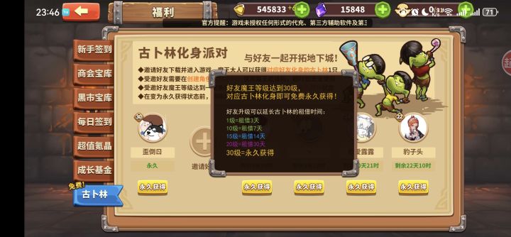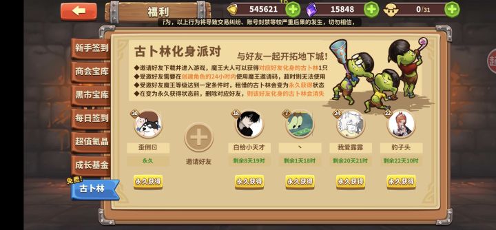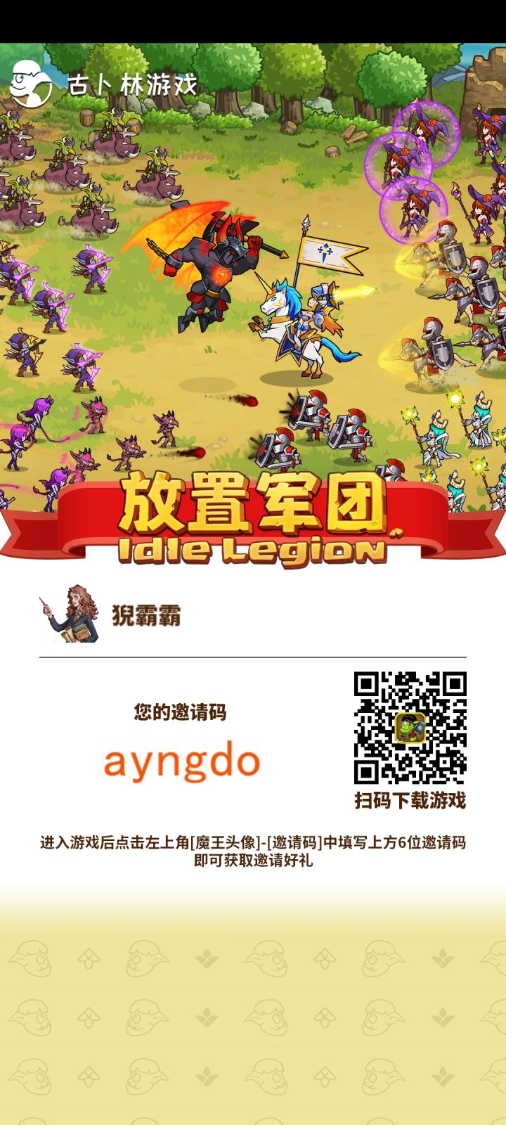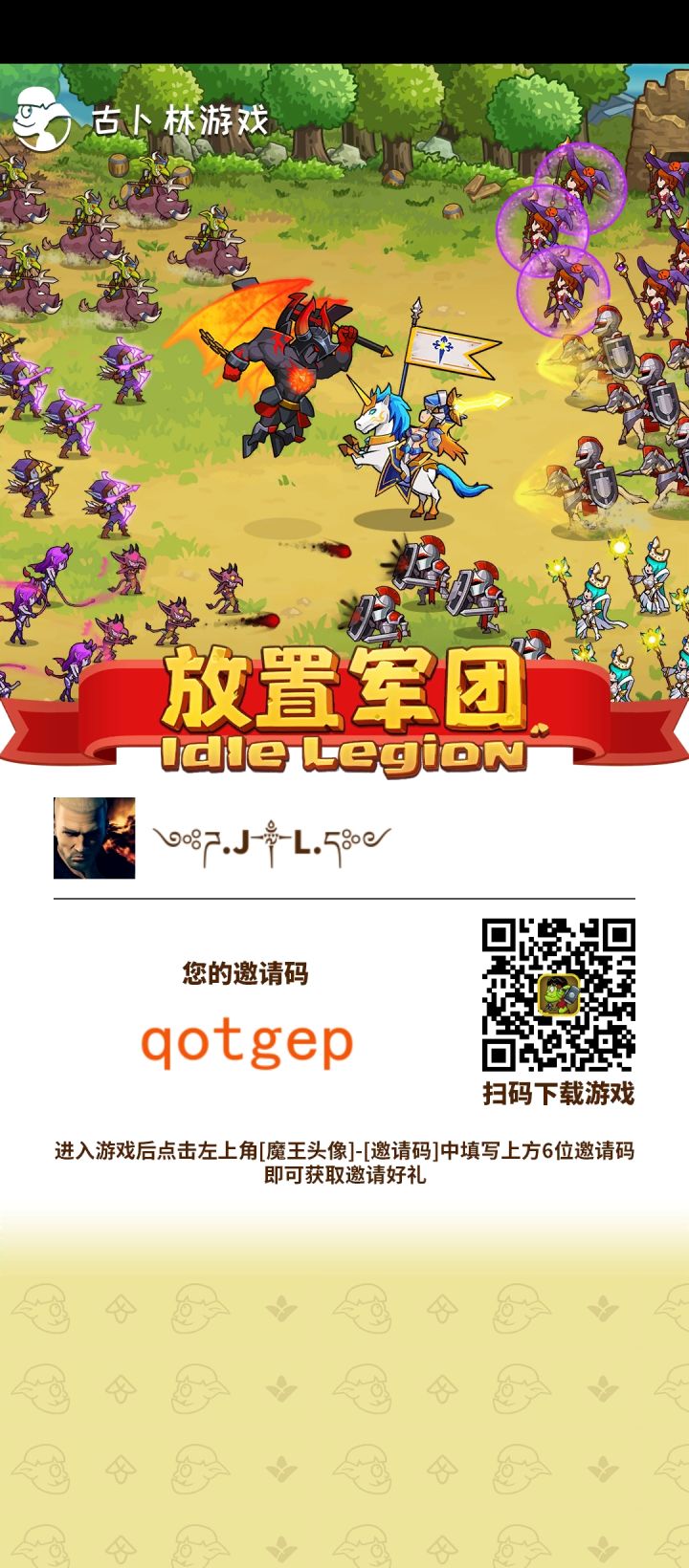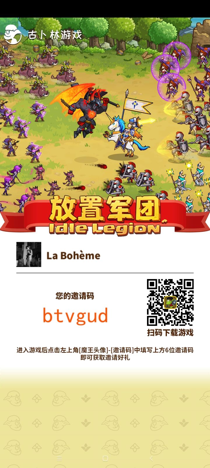 11月最新邀请码 bpzgdo(进入游戏后点左上角[魔王头像]-[邀请码]中填写bpzgdo)。填写邀请码即可获取被邀请好礼。【1000氪晶】输入邀请码开局就能领到1000氪晶。等15级修建了回收站,还能来我这卖高价(18倍起)特产,这是前期另一个重要的魔晶来源。另外关注公众号:古卜林游戏,输入以下内容,魔王5级后邮件获取福利(以下为兑换码)1.放置军团666 (200氪晶)2.FZJT
