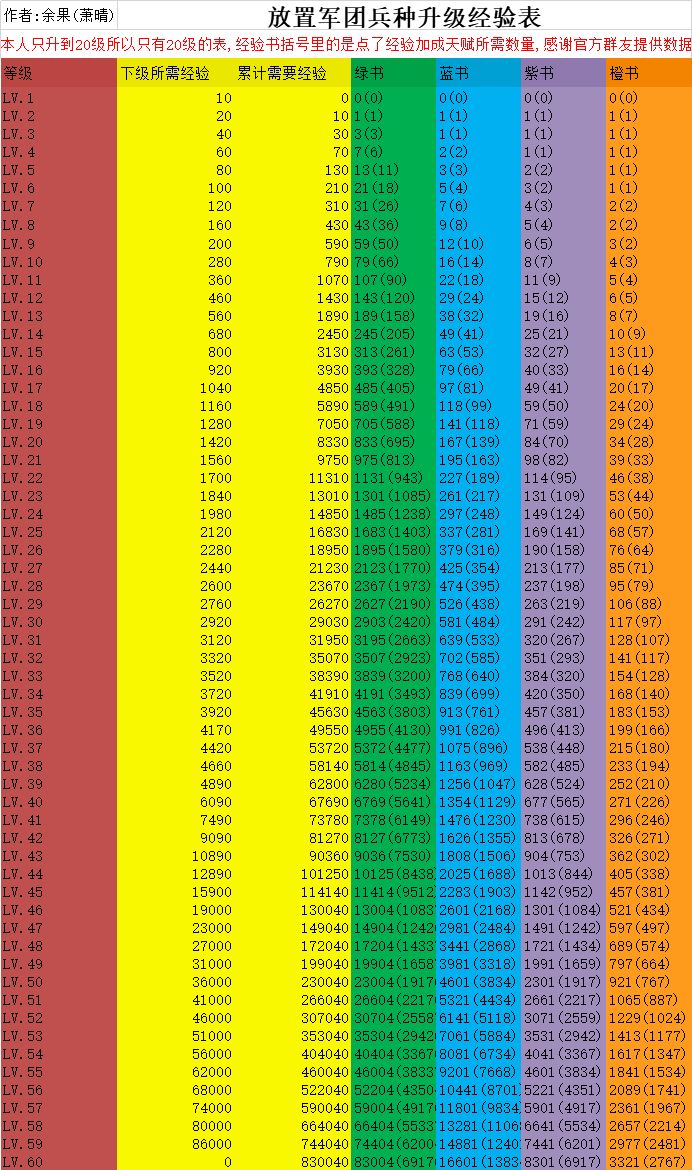 放置军团兵种升级经验表和计算器到60级