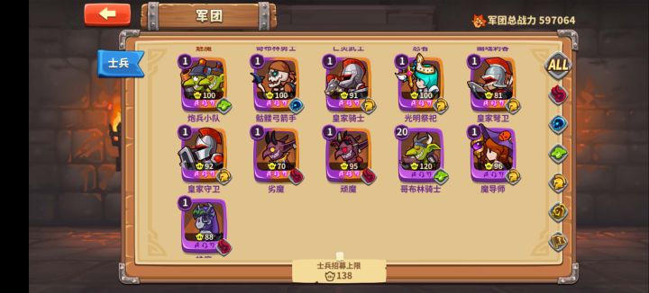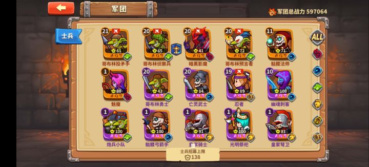 魔王30级,0氪,今天才抽到的哥布林炮手,听说很强想养,但是哥布林长矛品质要高,不知道值不值得现在去养炮手。忍者现在装备和等级都是20级,一些阵容用得到,不知道还要不要继续升级。哥布林骑士抽到很久了,太难抽了,抽到了半个月也没升个品质,不想养了想去养皇骑。亡灵武士也想养,但是感觉跟幽灵忍者一样目前都是装备20级,能用但没有太大用。听说顽魔劣魔和蜘魔也有用,面对刺客多的阵容确实缺顽魔劣魔,求大佬指点