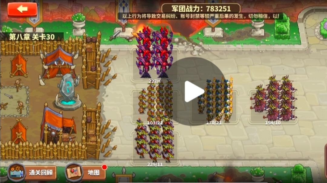 有三个关键点: 1.哥布林勇士摆在后面保命,可持续激活人多势众buff。 2.猪期带一个进化装置金或者哥布林套,冲人堆里多抗一会,后续输出靠哥布林炮手和影魔。 3.哥布林预言家一定要带哥套,防止被皇家守卫反弹伤害死,哥预不死可持续放萝卜当肉盾。 很多人无四件套过不了第八章8-30,按照这个阵容,78万低战力哥布林两件套轻通关第八章!#放置军团