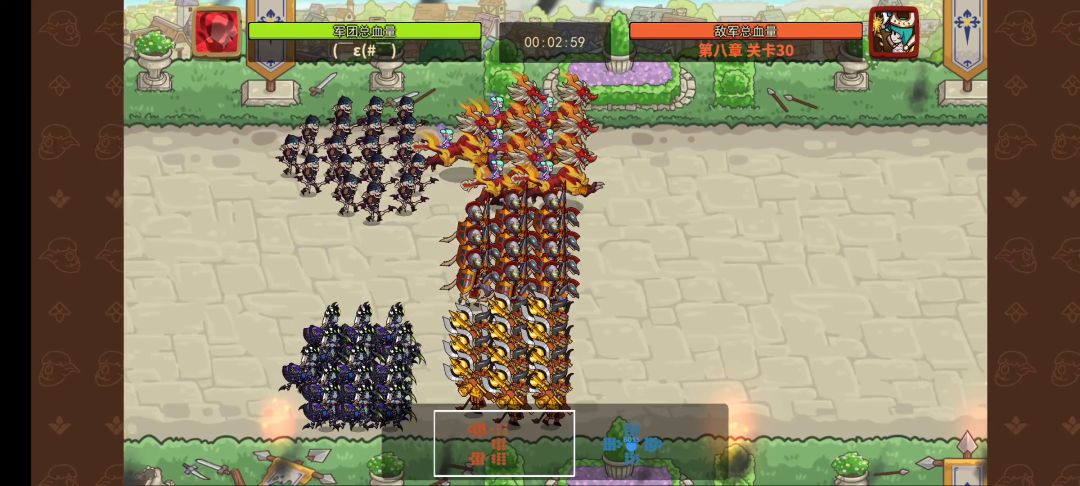 终于通了 开始养老8—2424有两路骑兵 上路用骑兵对冲 下路用蜘蛛网住用顽魔 蜘蛛 骑兵三队快速敲后排 两队可能没的也有点快 所以我用了三队(蜘蛛有时可能还没放网 被骑兵冲掉 需要多试几次)8—25因为麒麟跳的问题 需要多试几次 尽可能在祭祀放出天赋前打掉 也就是第一波就打掉祭祀 然后麒麟和皇骑需要拖住对面 在只剩boss时被打掉半血前不能让boss到后排 因为boss有个免控 后排