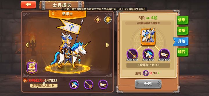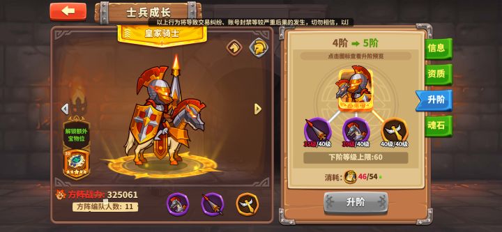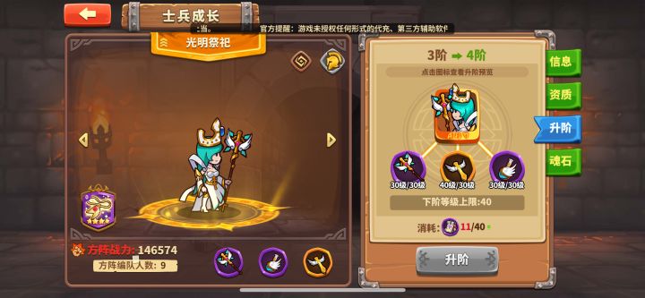 人族进阶11 低战力,低配置,一通人类进阶11 半套套装,三黄40级,另外两个30级。 只需要不到一百一十万战力就可以稳定了 其他人攻略的十字阵真的不行,低战力一定要避开两队死骑的冲撞,并且黄骑切骨弓 那最好的就是后置占位 黄弩站上面第一时间尽量把骨战打,不然后面复活比前面复活影响大很多
