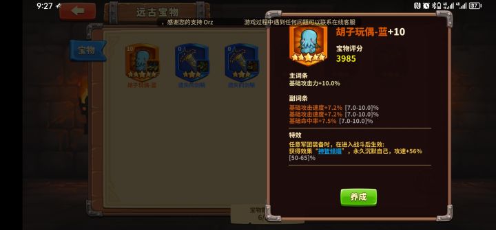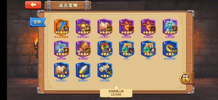 四星宝物溢出太多了放置收益+30% 卷轴消耗-10% 加上大月卡刚好够一天开一个打5个八几乎每天两个以上四星一天溢出一个哥布林项链都5个了 一个战旗也不见主线到9-16通关记录里都是有哥套的