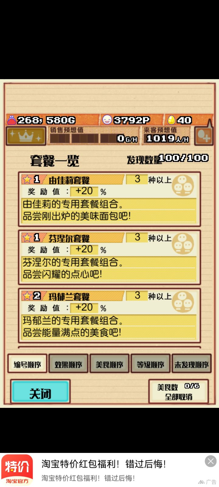 除去主角6人的套餐,6人每种做法的套餐(18种),36种食材(同一种食材一个套餐),6种人群(同一种人群一个套餐),除去以上套餐。正片开始#攻略