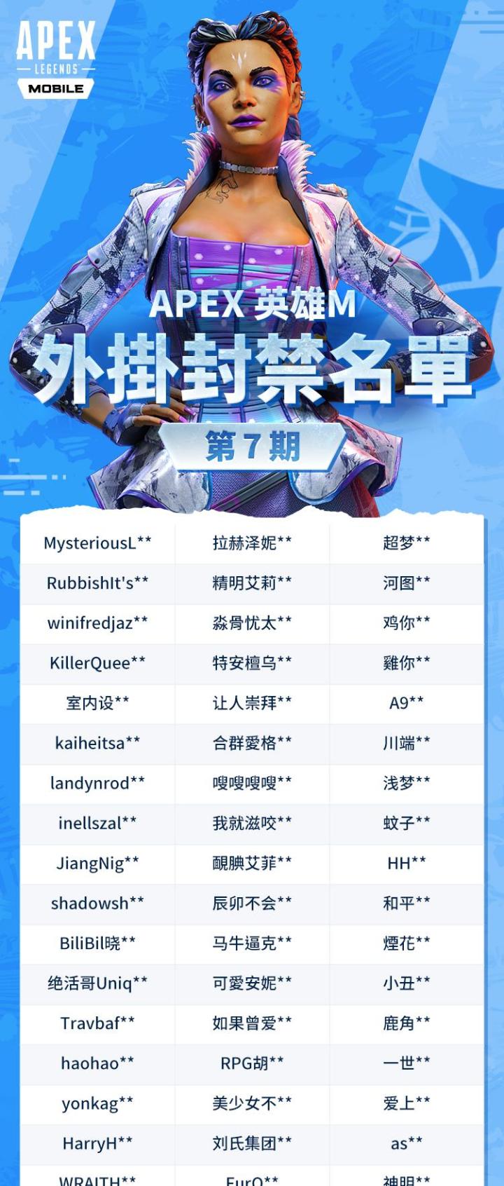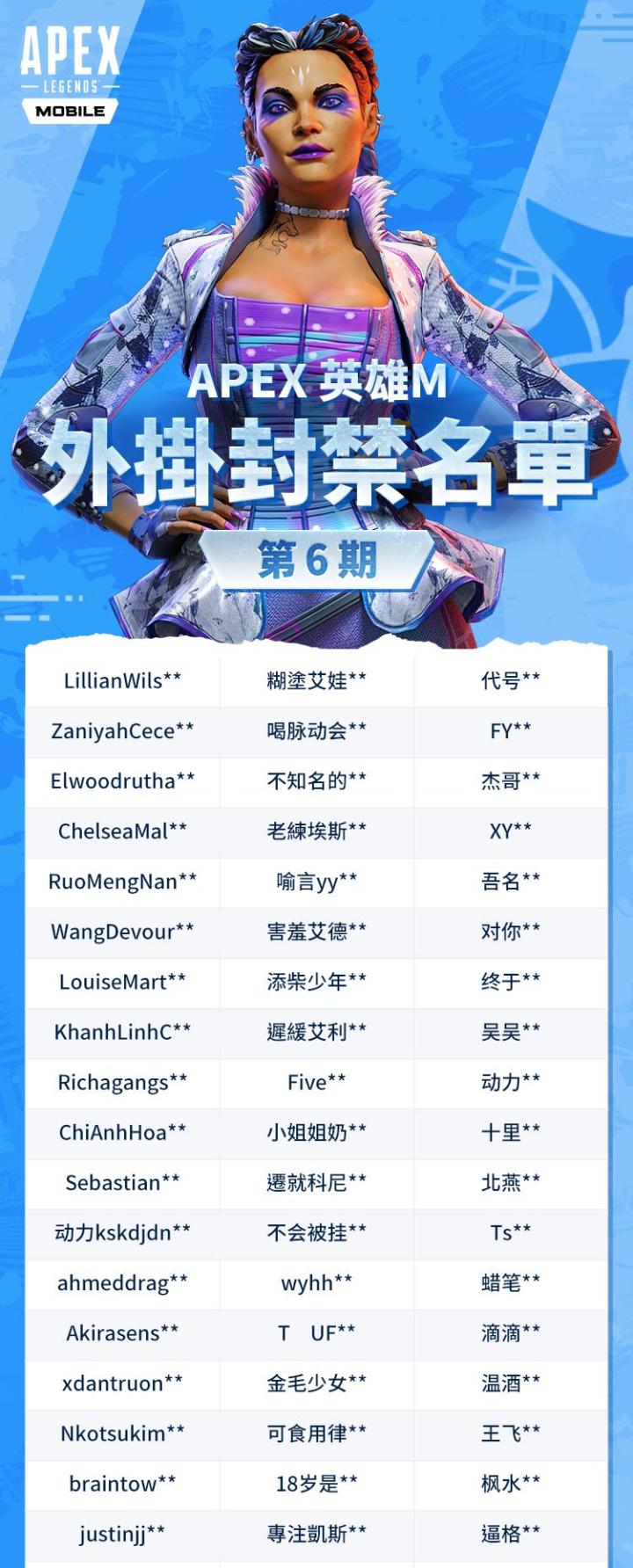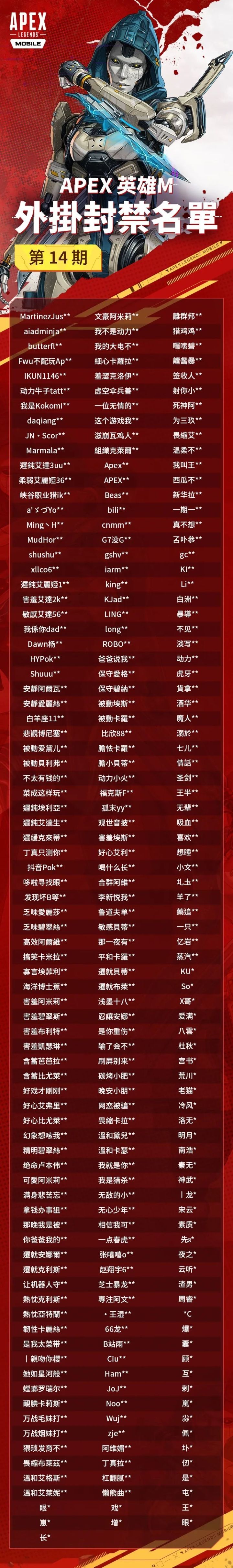 亲爱的捍卫者们:Apex 英雄M官方社交媒体(「Apex 英雄M」公众号 & Facebook 公共主页)近期更新了第二期港澳台服外挂封禁名单,正文如下:【为维护公平公正的绿色游戏环境,《Apex 英雄M》安全系统24小时无间断运作,实时监测并分析处理对局中产生的异常数据,绝不放松警惕!我们将对各类违规、作弊行为保持零容忍的态度与强打击的力度,以确保玩家们的竞技体验免受干扰。再次提醒大家珍惜