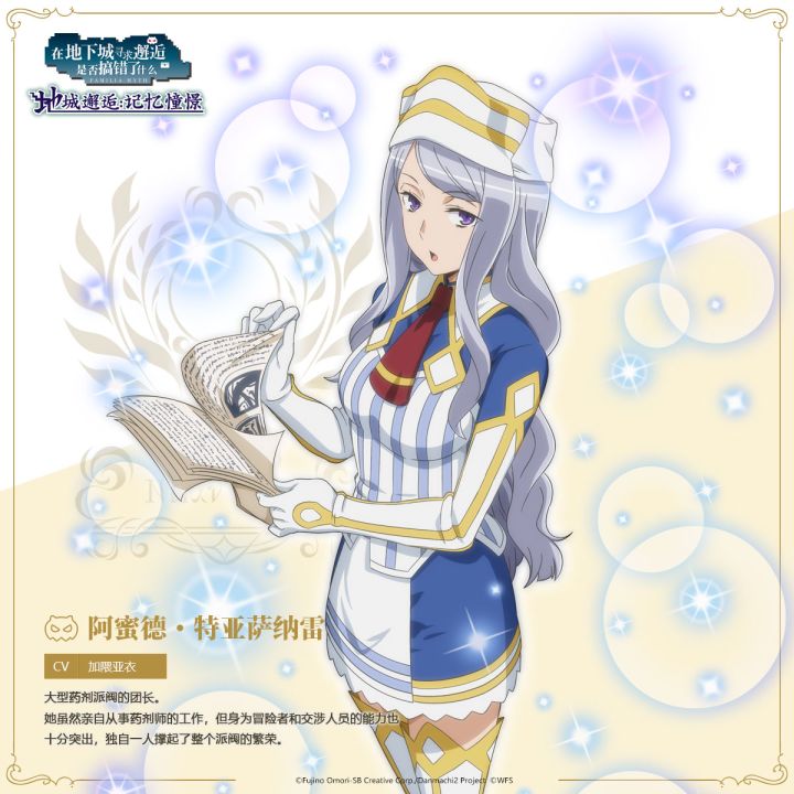 大家好,我是您的冒险顾问埃伊娜。最近的天气越来越寒冷了,各位冒险者要注意防寒保暖哦!在欧拉丽则有像米赫眷族,以及迪安凯特眷族这样的药剂派阀,为前往地下城的冒险者提供支援,让他们时刻保持最佳状态!今天要介绍的这位角色,便是迪安凯特眷族的团长——阿蜜德·特亚萨纳雷。========种族:人类眷族:迪安凯特眷族声优:加隈亚衣大型药剂派阀的团长。她虽然亲自从事药剂师的工作,但身为