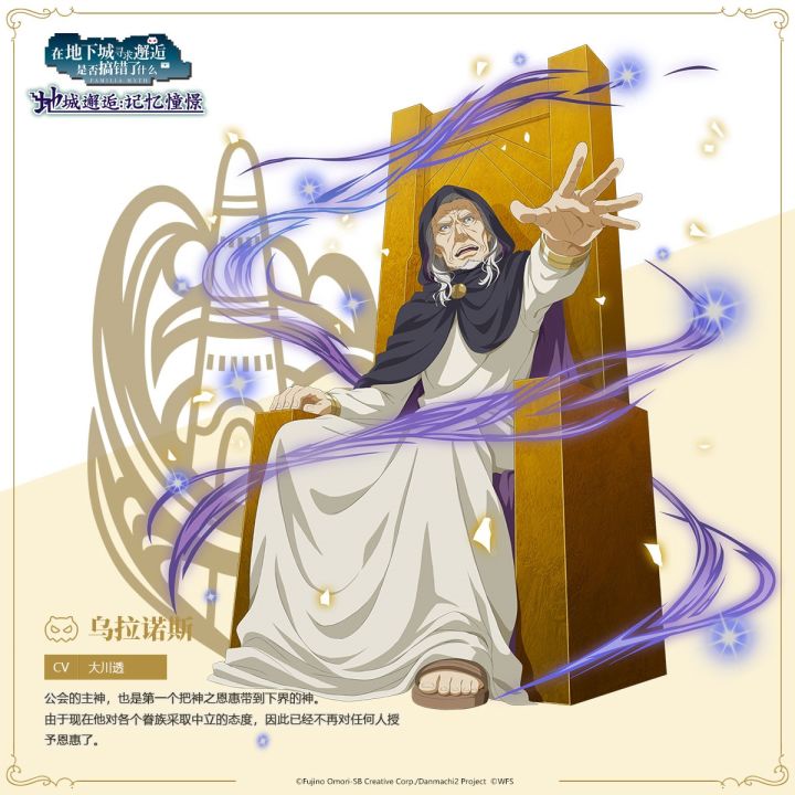 大家好,我是您的冒险顾问埃伊娜。今天要介绍的角色是个大人物,虽然在本篇中不常看到他的出场,但他确实有着举足轻重的位置。他就是第一个把神之恩惠带到下界的神明——乌拉诺斯========种族:神眷族:公会声优:大川透公会的主神,也是第一个把神之恩惠带到下界的神。在上古时期,他建设的要塞都市是欧拉丽的原型。在那时,他创建了后来成为公会前身的组织。现在,他仍然在公会的地下不断献上祈