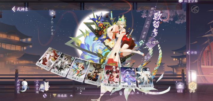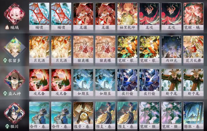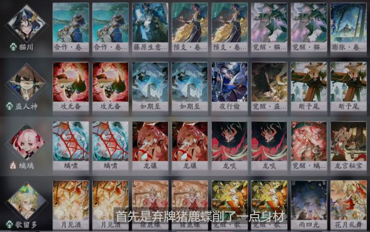 因为三角洲10.5暗黑事件,连带着我精神没那么高,一点也不想打弃牌歌,所以大部分都是纯文字。——PS:我没有玩三角洲。首先,北笙歌。然后,带卡问题。歌的最高上限就是这样带的,我是合了两张极卡,但不可能满编的。另外,没有极卡的话,我是带了花叠百景(这个廉价提速带卡最后提)。猫川藤原生意人不好用。起手几率问题;歌留多挂机,且花札牌容易爆牌;猫川觉醒容易吃解。没条件满编夜行偷,可以上珍宝阁