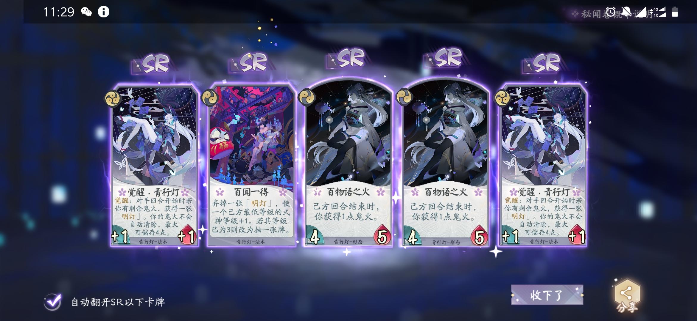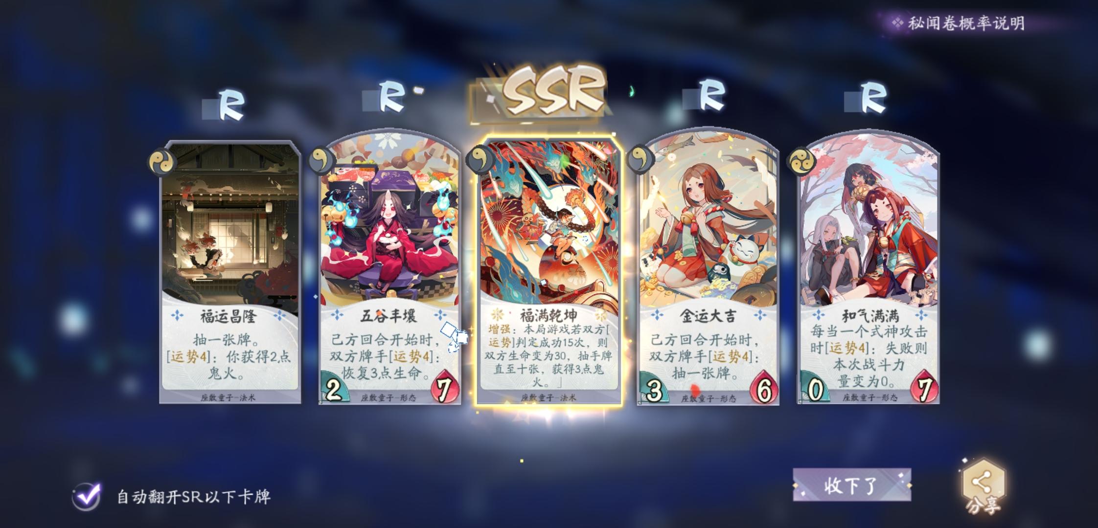 白嫖玩家,签到20天,抽了83发,现有SSR10张,分了一张,合了一张,其余都是抽的和剧情什么得的,(虽然有10张,但我用的卡组就桃花用上了)主线第六张通关,第七章还没解锁,天梯5阶没咋打,嗯,就这样了,预祝大家元旦快乐呀!