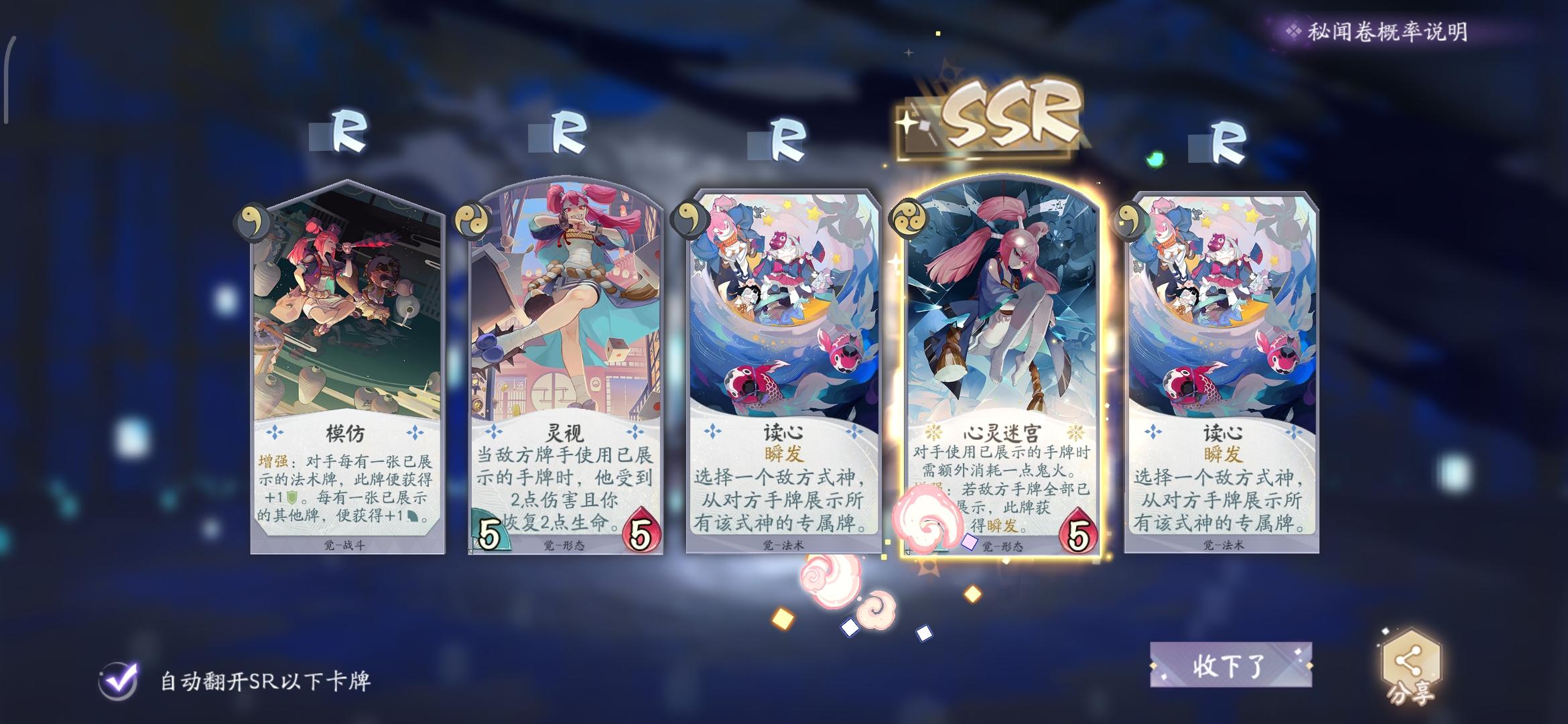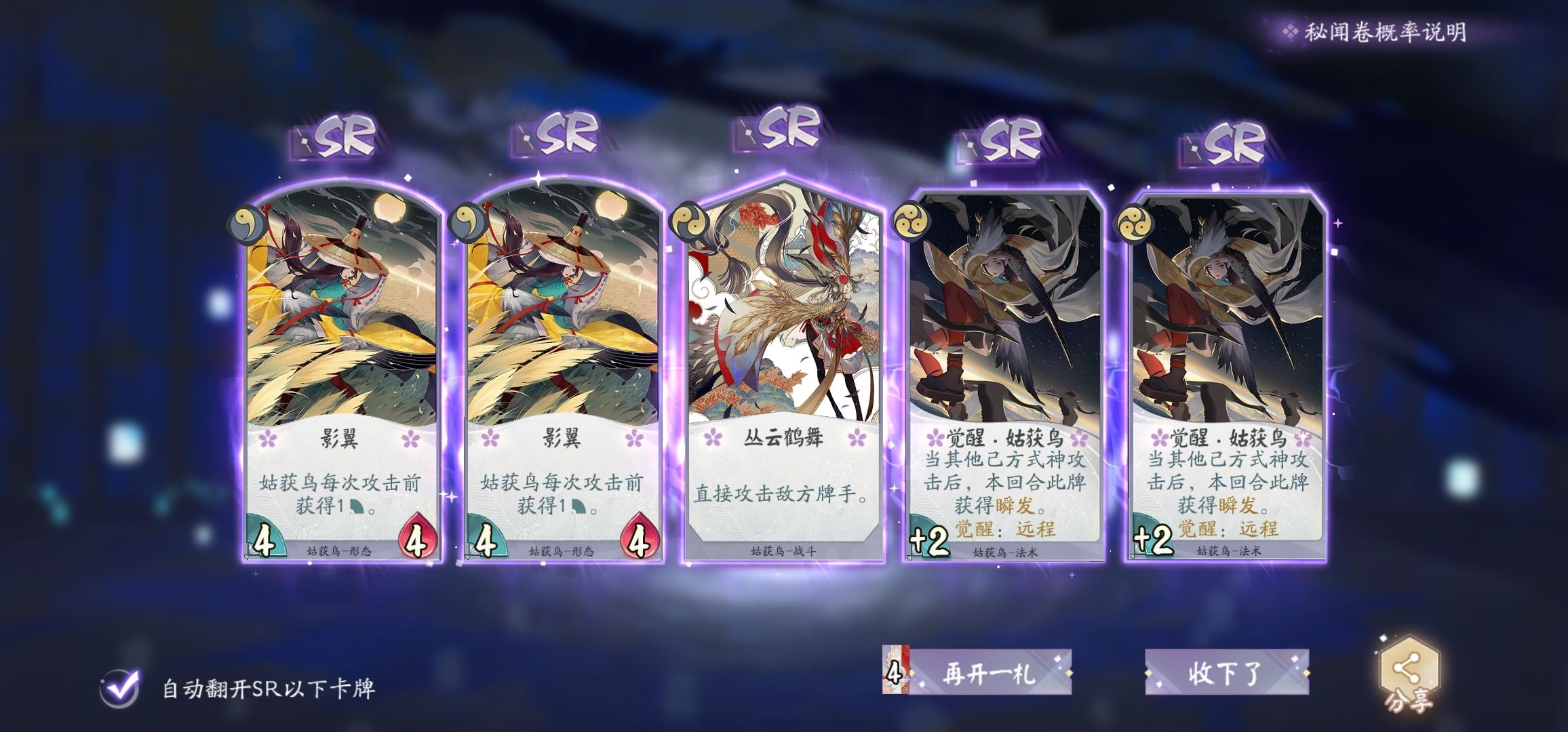 倾家荡产合了一套半成品书翁过牌流,昨晚熬夜上的六段。买了五卡包一个雪女SSR,还有一判官卡包,重复我三张SR。绝对是后台针对我!!