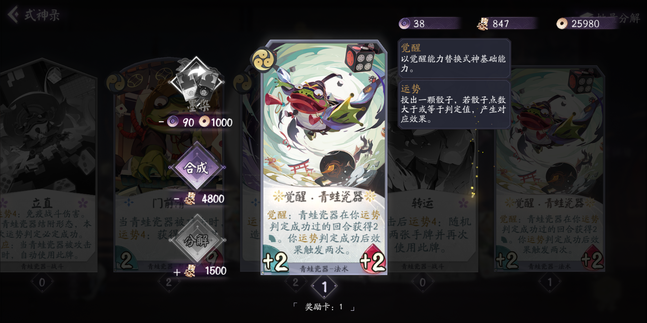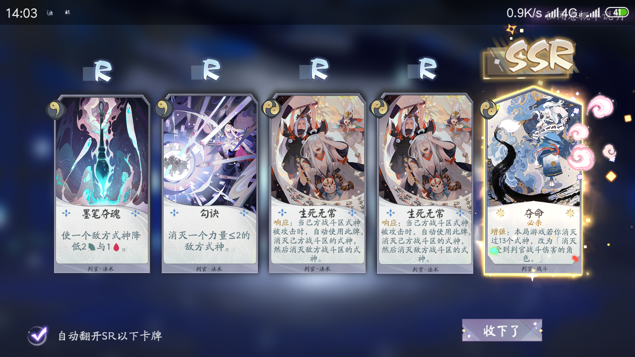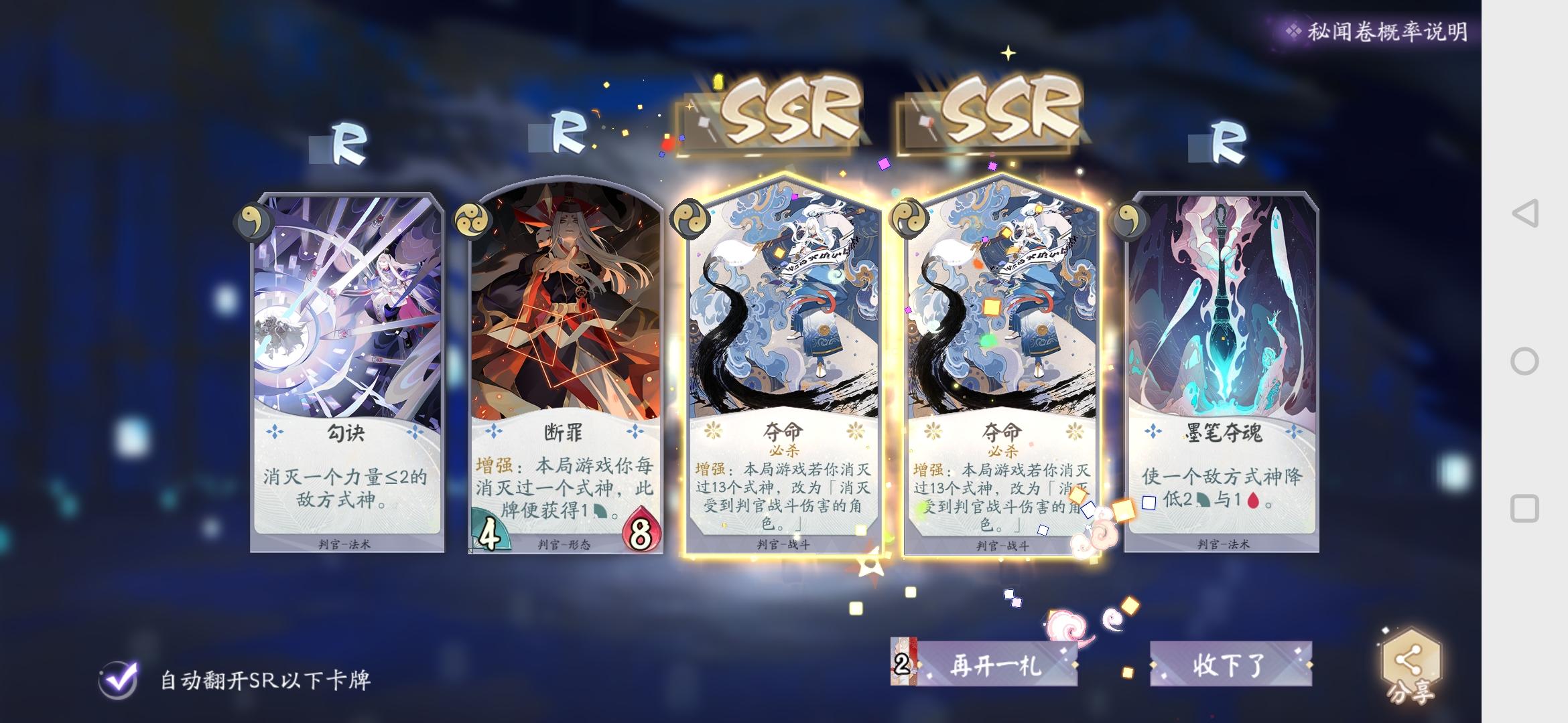还有一个清姬的SSR被我分了做觉醒兔了,一共就抽到过4次,居然还能出来俩一样的,第二个妖琴是刚抽的,还热乎