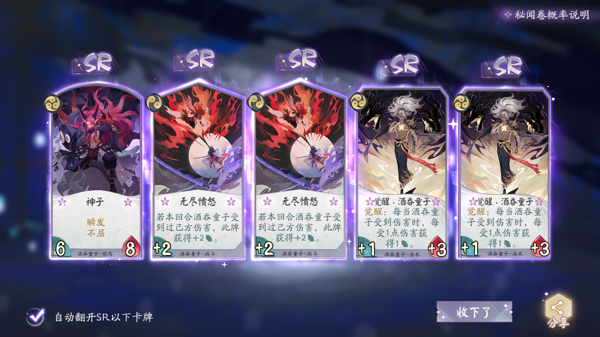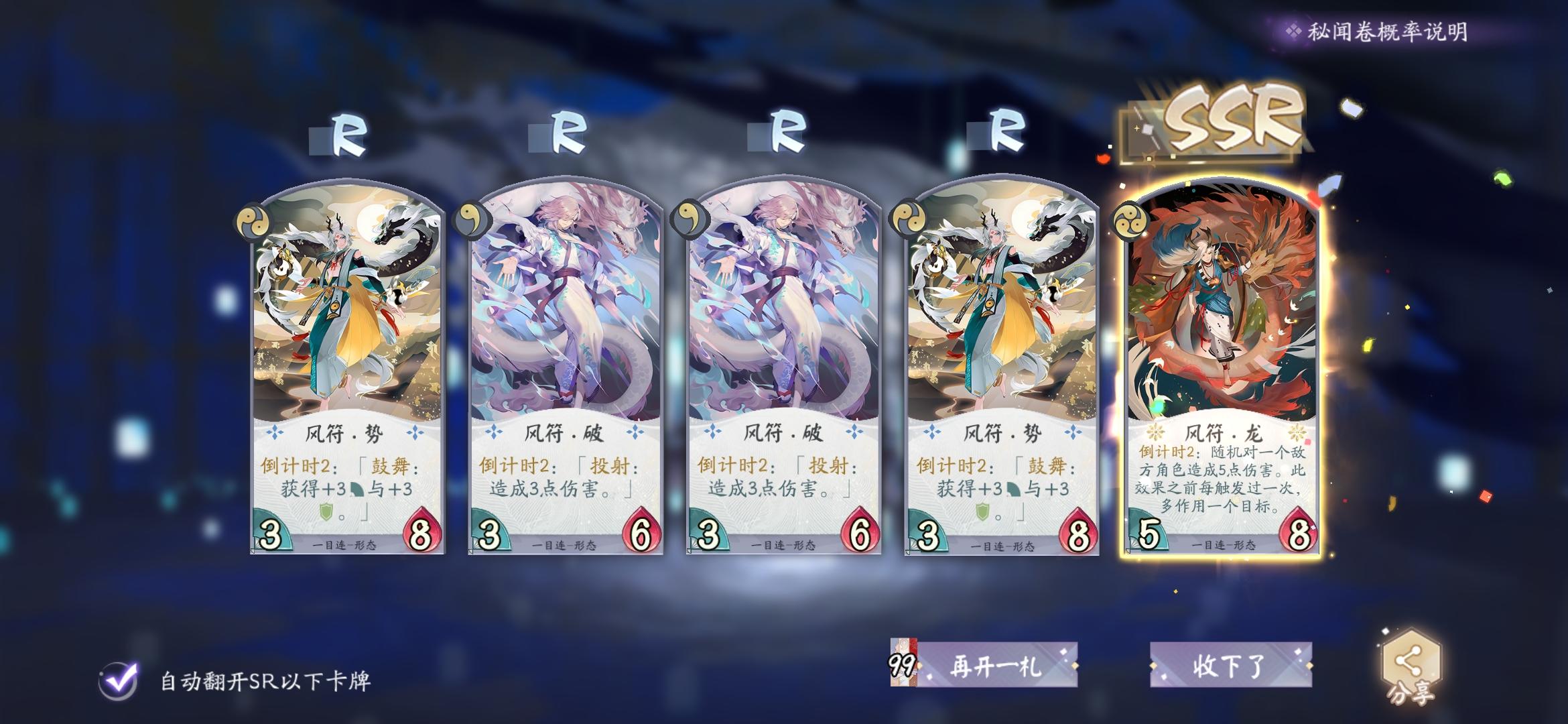 76包四张ssr,另外登陆送了张无我,硬生生凑齐了白狼唯二的ssr卡。平均二十包一张,真是令人熟悉的爆率呢。