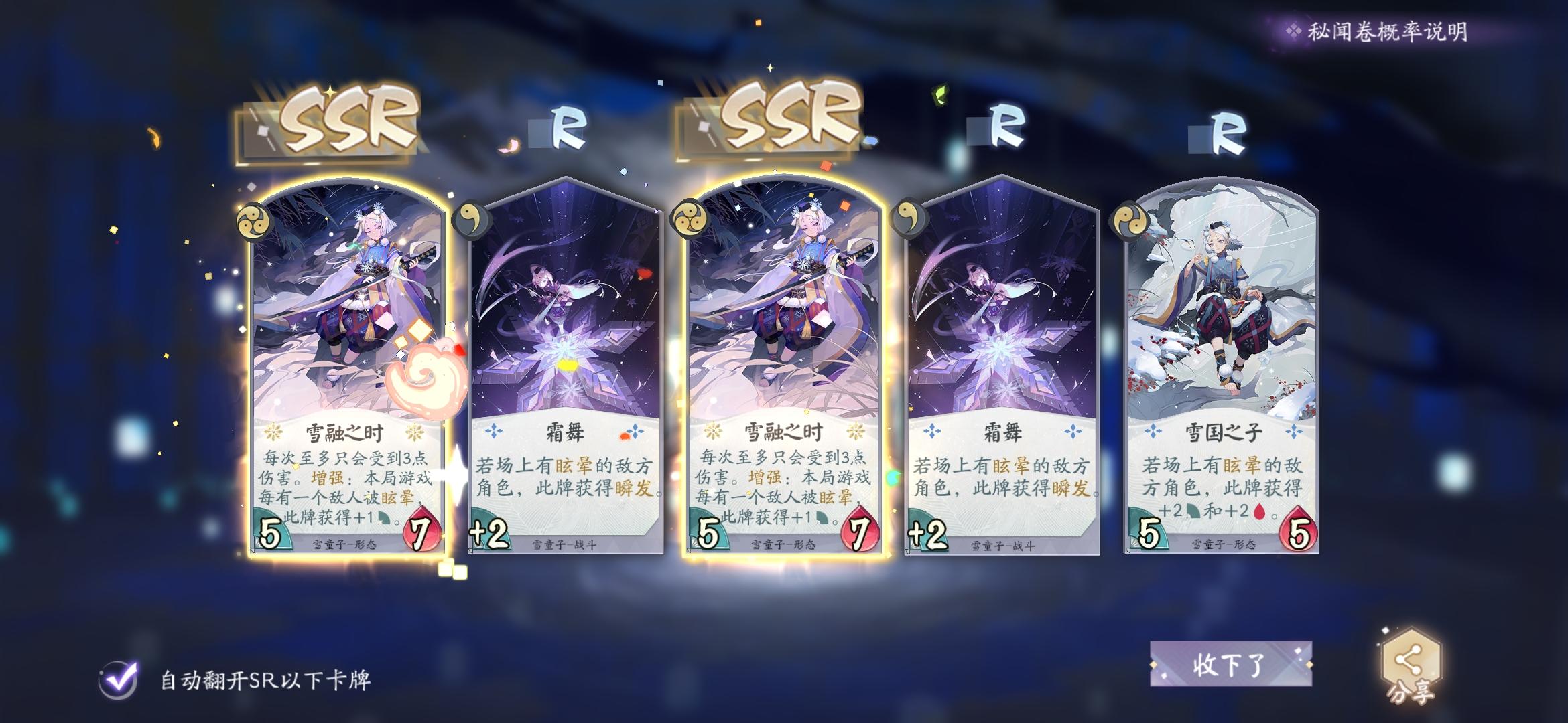 玩了游戏一周多,觉得有不足,但是还挺好玩的,新手礼包,战令都买了,觉得卡还是太少了,刚刚就充了个328加上之前的勾玉买了60卡包一路下来全自动翻,sr一共不超10张,ssr保底两张🤮ok,我所有游戏都非我认了,两张ssr都重复的啥意思🙂🙂鸟姐虽然我不玩,但是还挺好用的,但是你见过正常人带两张犬神觉醒,两张山童觉醒的?(山童ssr是我之前抽的)今天早上还想玩几盘jjc现在心里跟吃了屎一样难受