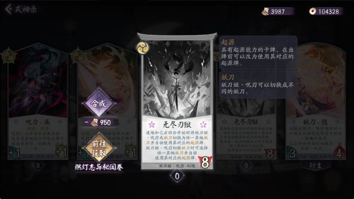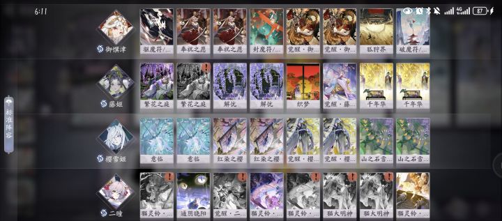 前两天刚用了全卡七天体验盒,所以这里面没有的卡其实都是能用的。最近几天只要打牌就只用这套,用下来感觉也挺不错的,前期召唤物站场给津津争取时间,二瞳三勾幻境跟全卡组的联动性都很不错,甚至可以在奉祝选中式神之后到出伤之前这段时间内拉一个猫灵到战斗区把津津挤回去让津津拥有一个远程词条(不过要小心别让猫灵把人打死导致津津丢失伤害),后期(正常发育的话)可以奉祝1Aotk但是用着用着突然发现,樱雪姬好像