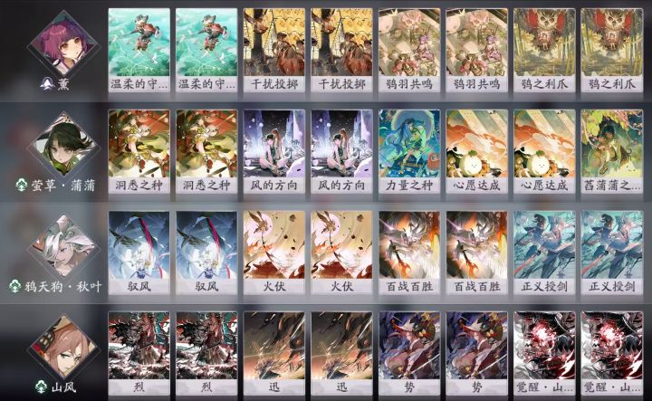 策划尿性无须多盐。一、带卡问题。1、山风选择4张一勾卡,可以解放更多二勾节奏好的队友。没错,觉醒是当一勾牌打。2、熏无须多言,没有余地打觉醒。3、鸦天狗·秋叶。选择剑/火,正义授剑给山风水神通,带极卡是为了更好凑增强。结论而言,如果山风打不出一套,你已经带熏了,换谁都没有伤害打死对手。所以,狗子剩下两张带三勾斩杀不了,带一勾也抢不动,选择觉醒开摆。4、第四人。把尝试