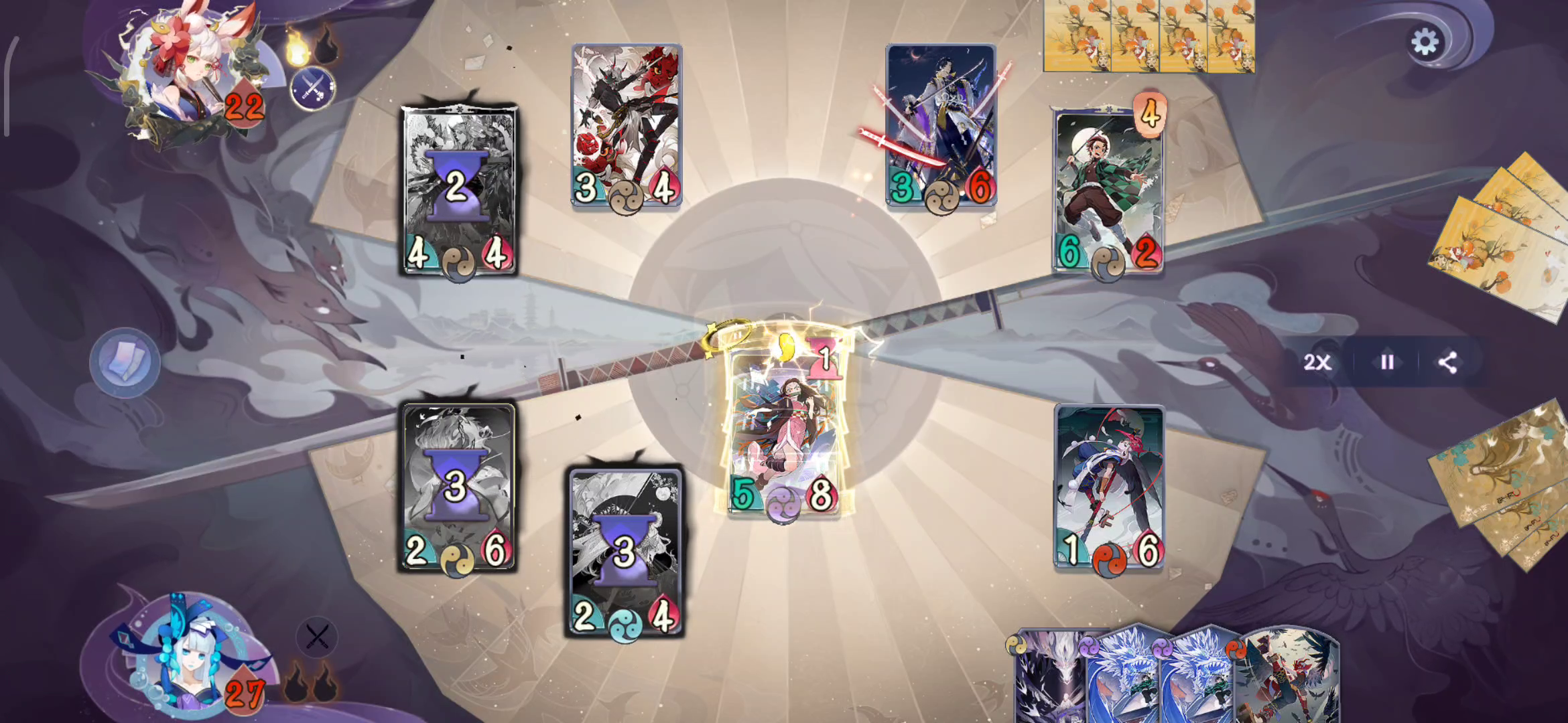 昨晚本想着冲冲名士,遇上了一个实在糟心的bug——用月坠被弥豆子反死,当时我4血,对面3血,我月坠26耐久了,在我回合的时候月坠触发,对面被扣成了-7血,但是,bug来了,弥豆子血鬼术把我的伤害反弹给我,我竟然输了!月坠是式神和牌手同时扣血的!更何况是我方先造成伤害,你游并没有游戏王连锁一速,二速,三速的机制,这伤害处理上必定存在某种逻辑错误,明显与动画不符,总不可能月坠是一个一个的打一炮,最后