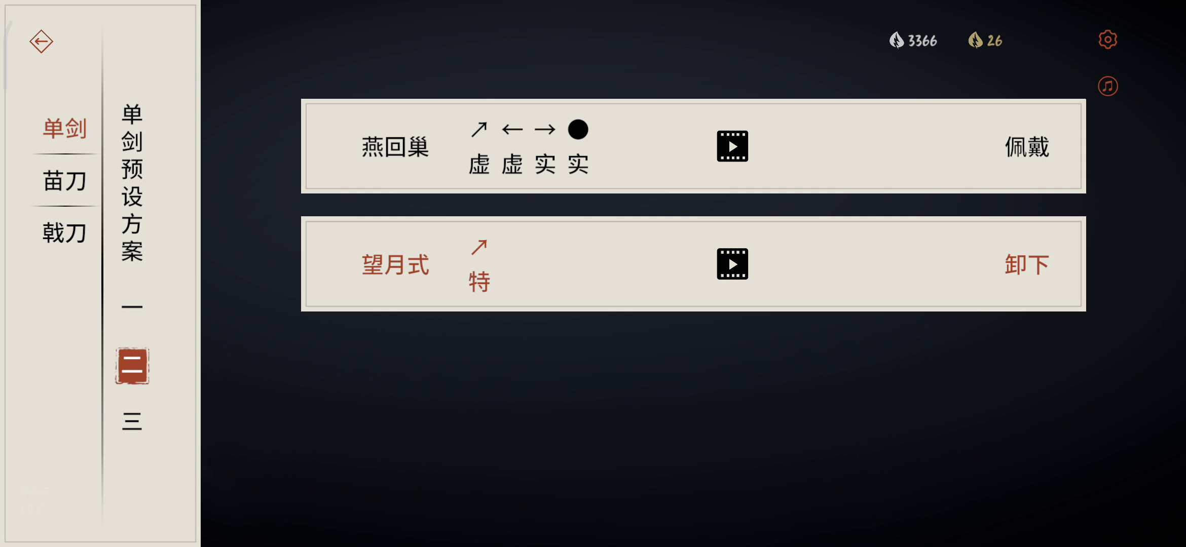 这个剑招方案只能设一个,怎么设都只有一套,设了一,二就全变一了,设二,一就全变一了