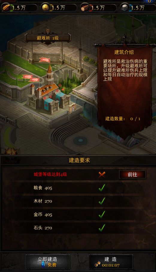 在《斩千军》中,避难所是玩家救治伤兵的地方,升级避难所可以获得更多的伤兵位置,以便治疗更多的伤兵。【如何建造避难所】 建造避难所需要城堡等级4、粮食405、木材270、金币405、石头270空地一块,满足这六个条件即可建造成功。【如何升级避难所】 避难所等级受到城堡等级的限制,升级避难所等级需要城堡到达指定等级以及消耗一定量的资源。 升级避难所的好处:可以提升伤兵规模上限量与自动治疗规模。