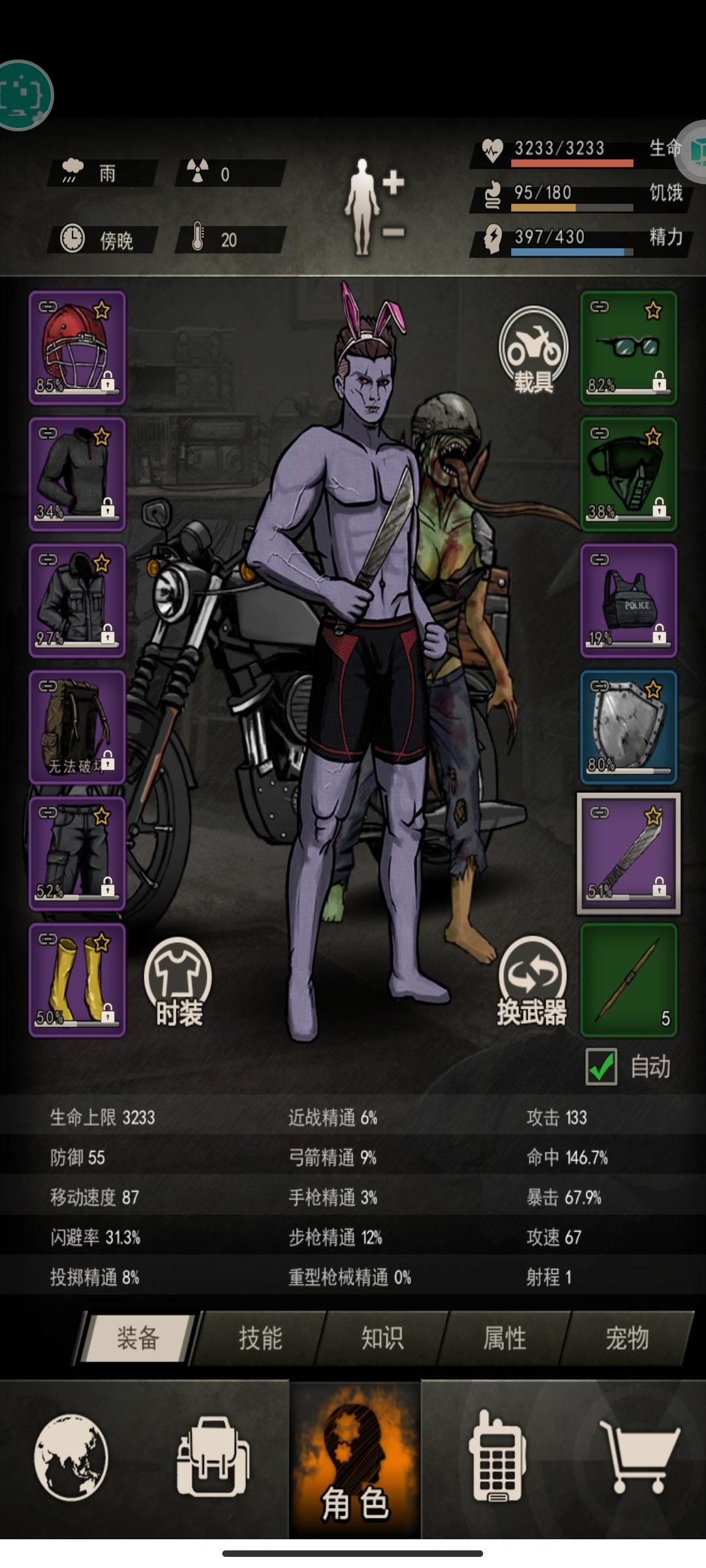 马上图七了,夜行者走一波。夜行者也就加强版猎杀。以上视频是无料理打的,没啥压力。双闪用好就可以,不然一样扛不住。先走两到三步开自动闪不用关,这样和甲虫毒刺同步,基本可以躲掉。走到第四步就突,可以躲夜行者连刺。突最好手动动,那来躲夜行者连刺。这两个闪用好基本就能躲掉这些主要伤害。3200血加130开吃料理应该都能打的。没啥大难度规避主要伤害就行。下面属性表:满级狗,满级浴血,一口700躲伤害。狗子