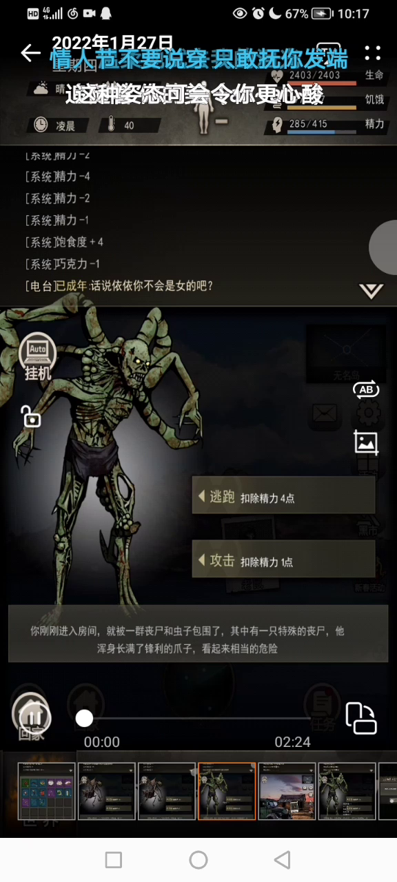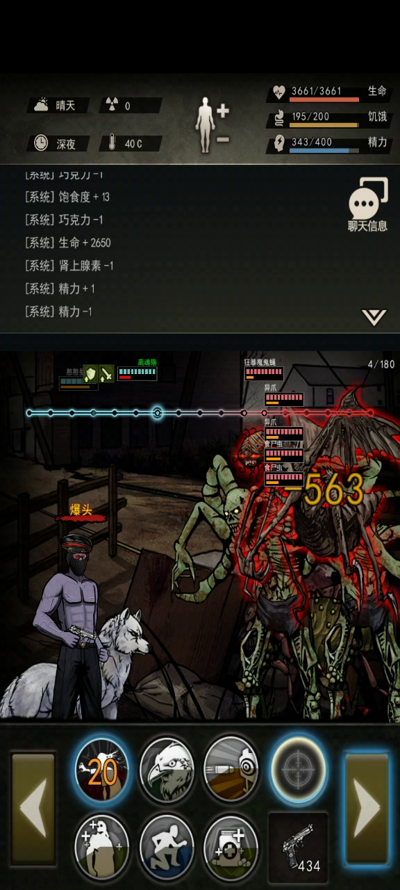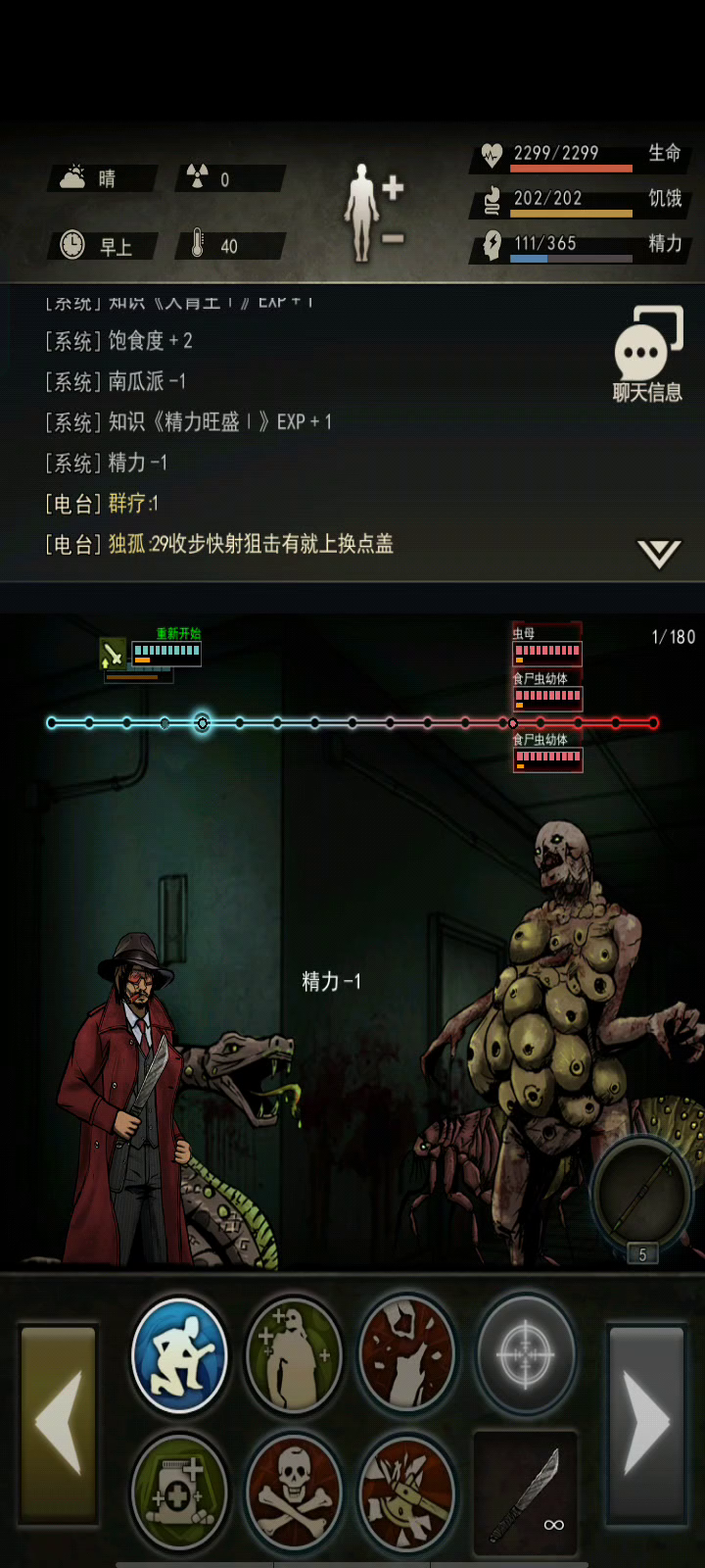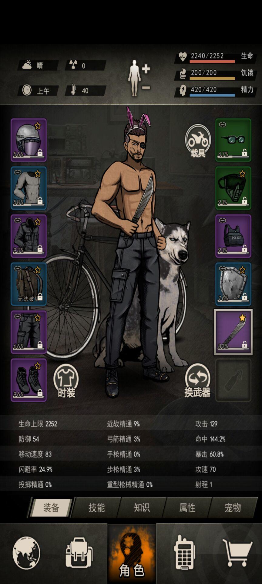 前面几次伤害不够,后面听取大佬意见,后撤换了破甲就过了。属性不吃药,血2138。攻100开山。防御48,精通6,技能两刀8,精8,闪7,高5,医学9。 丧尸猎人4级,不知道用处大不大。