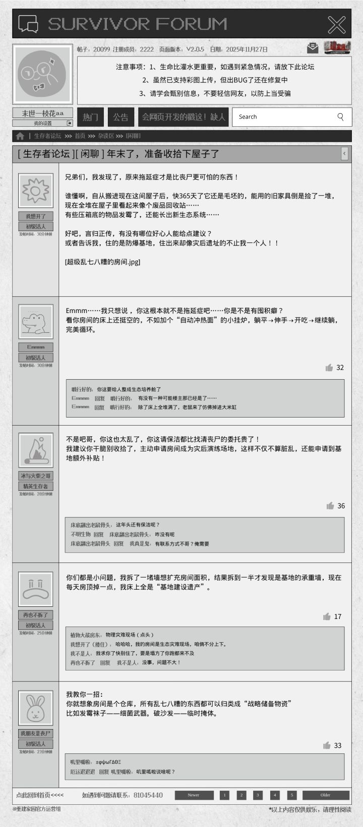 >>>>>用户【末世一枝花aa】已成功登入【生存者论坛】正在查看【闲聊】年末了,准备收拾下屋子了!>>>>>本月发帖奖励:带上【所在区服+游戏名】投稿你喜欢或未来想要见到的房间皮肤(如海洋馆、埃及风等),即可参与随机抽奖奖励:书匣(绑定)*5 (3位)活动参与时间:2025年11月27日-12月4日开奖时间:2025年12月5日