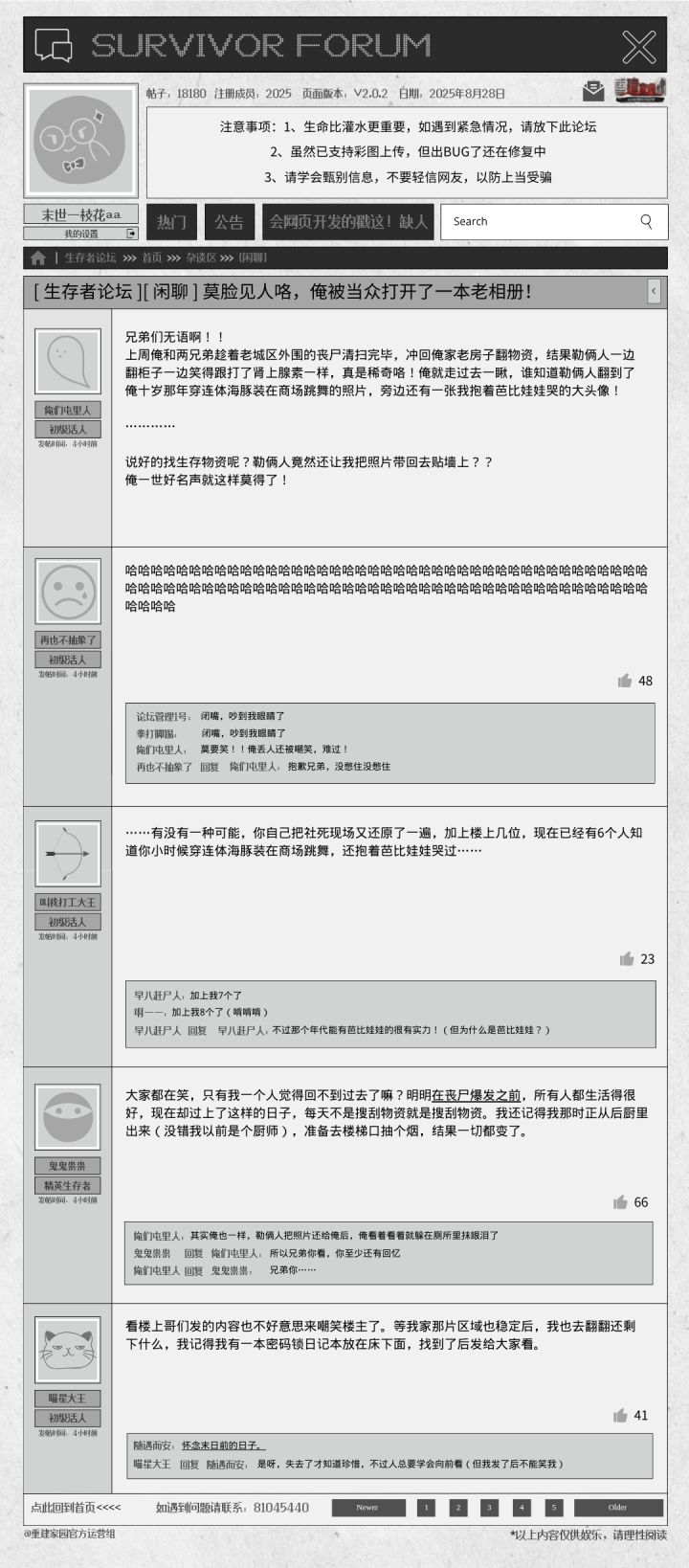 >>>>>用户【末世一枝花aa】已成功登入【生存者论坛】正在查看【闲聊】嗯,在档案馆看到了许多东西>>>>>本月发帖奖励:带上【所在区服+游戏名】回复与图片相关的内容,即可参与随机抽奖奖励:破旧书籍*10(3位)活动参与时间:2025年9月25日-10月8日开奖时间:2025年10月9日