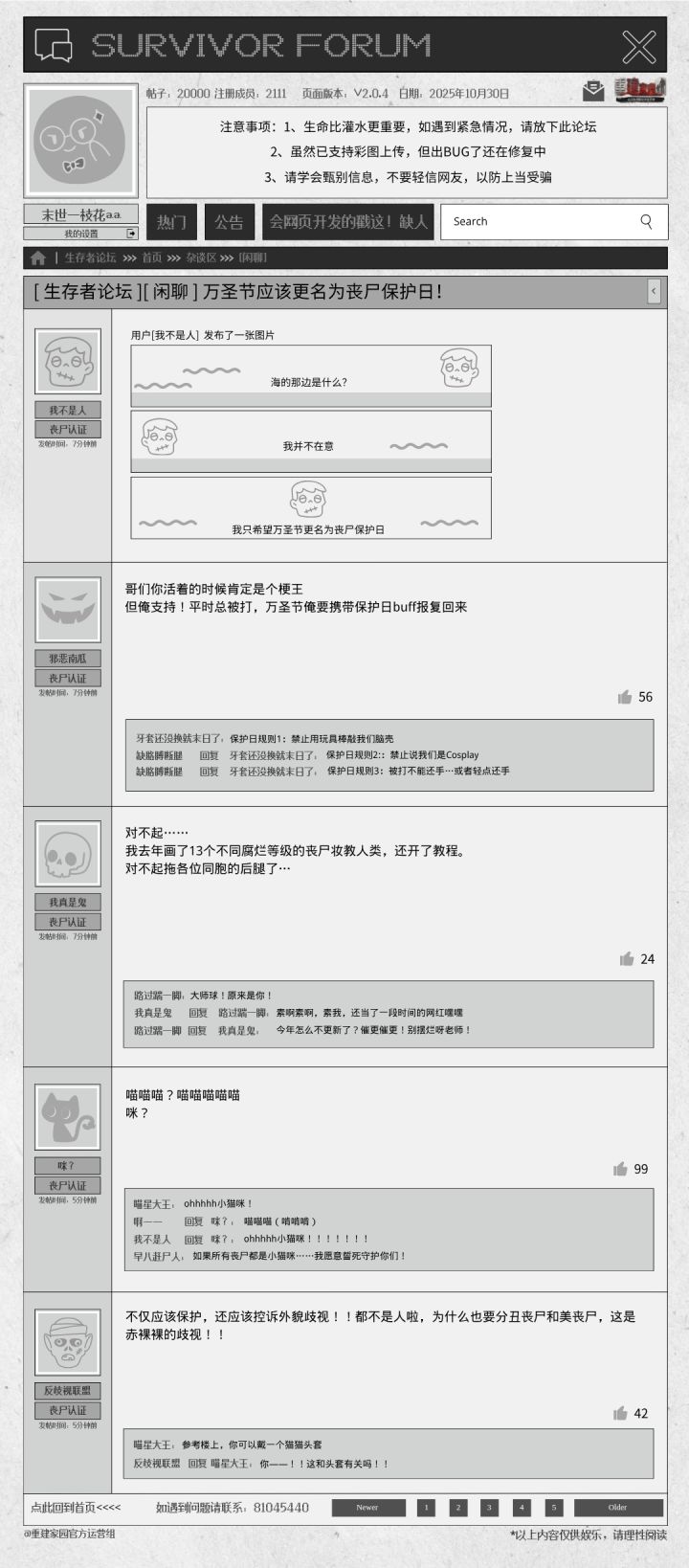 >>>>>用户【末世一枝花aa】已成功登入【生存者论坛】正在查看【闲聊】万圣节应该更名为丧尸保护日!>>>>>本月发帖奖励:带上【所在区服+游戏名】回复与图片相关的内容,即可参与随机抽奖奖励:破旧书籍*10(3位)活动参与时间:2025年10月30日-11月6日开奖时间:2025年11月7日