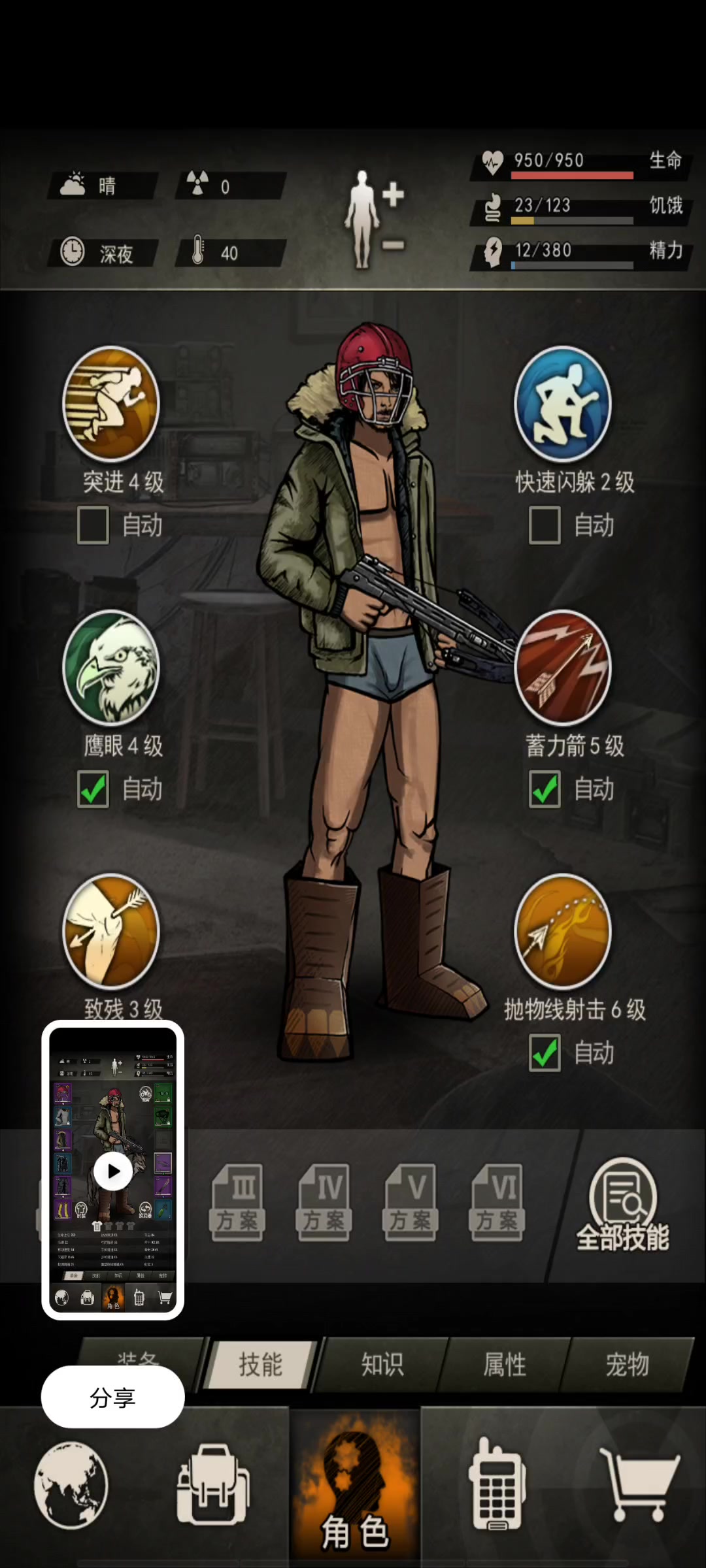 机械弩是真的菜,造价和羽箭成本很高,但是效果不如同为紫武的开山。攻速也没反曲弓快,过舔不如用刀,玩机械弩真不如玩反曲弓。 因为没有回血技能,并且没有诺基亚防弹衣,可以参考我的面板属性,因为武器是机械弩攻击力会比较高,但是攻速不如刀。战斗时我还闪避了两次才勉强通关的,所以如果没回血技能又不闪避,防御不变的情况下,应该是要1200血稳过。如有回血技能会好打超级多。 投掷物强烈推荐带燃烧瓶,主要就是要先
