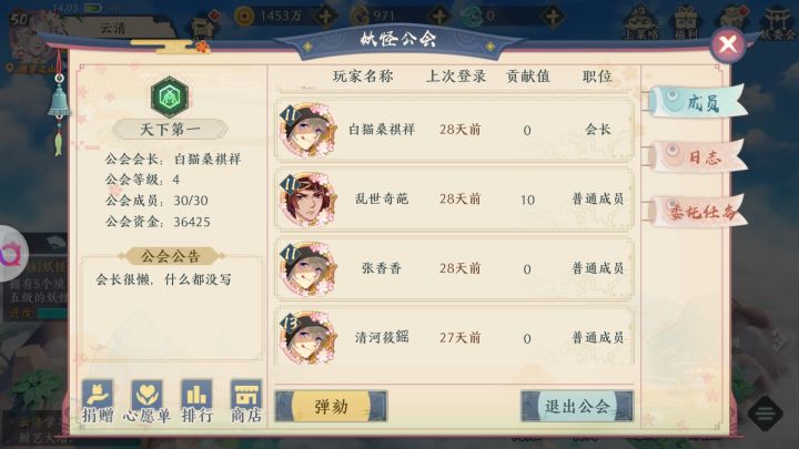 会长一个月没上过线了,想来是不玩了 ,弹劾又要五个人同意才行,但公会成员除了我,全都有差不多一周没上过线,想来也是不想玩了,这个时候除了退会就没其他方法了吗