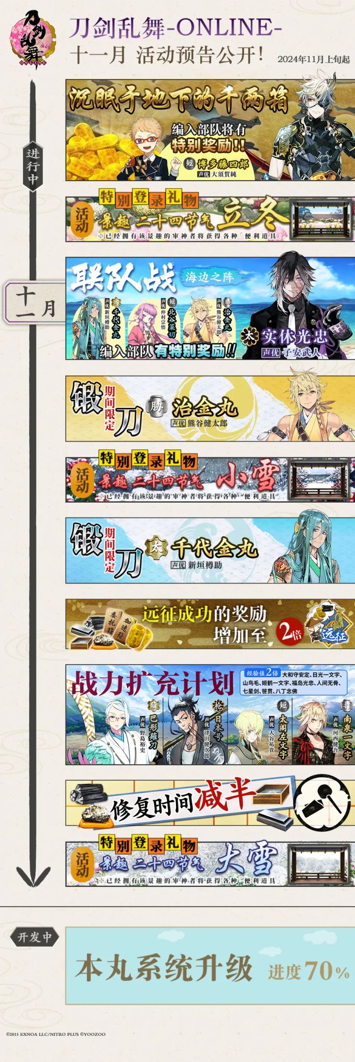 11月课表如下1.联队战~海边之阵可能是复刻国服上一次海联的2.战力扩充计划除战扩外获取途径巴形薙刀 锻刀、5-4道中、兑换所日本号 锻刀、6-4boss、花火、兑换所太阁左文字 花火、兑换所南泉一文字 8-3boss、兑换所3.远征2倍4.限锻治金丸 all700 00:40:00(2500积分)千代金丸 all700 3:00:00(2500积分)除限锻外其他获取途径