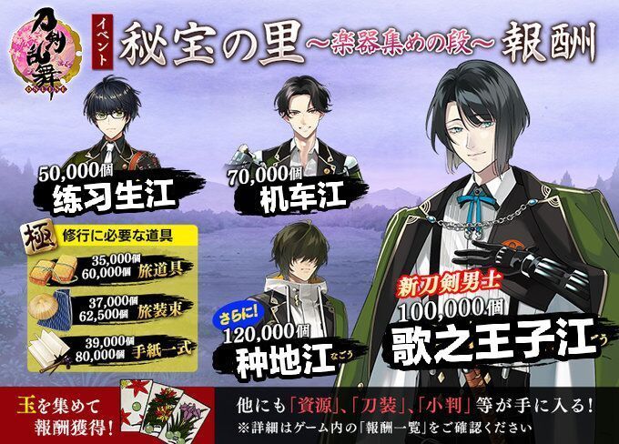 国服的一颗大卫星落地了,而第一期的花札已经在久远的17年了。可能大家都对这个秘宝之里有些陌生,于是乎我就自行整理了一些看似攻略的信息来分享一下。有纰漏请见谅,并欢迎指出。会修改,日后也会自行补充(可能x)=======分割=======1.活动类型①是有点类似于联队战的活动,即收集定量的玉获得报酬,最终报酬的要求最初是4w,然后变成6w,8w,到现在的10w。最终奖励都是刀剑,第一期为物吉