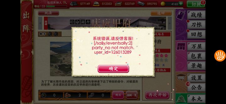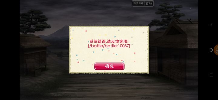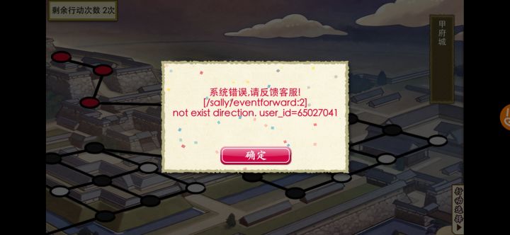 游戏上线继续打活动图,进去准备选阵型战斗就会弹出这个系统错误,点确定直接回到登录界面。