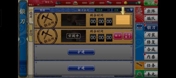 大家我想问一下,我在锻刀那个界面,点击扩建购买了。为什么他没有开啊?甲州金已经扣了但是它没开是怎么回事??