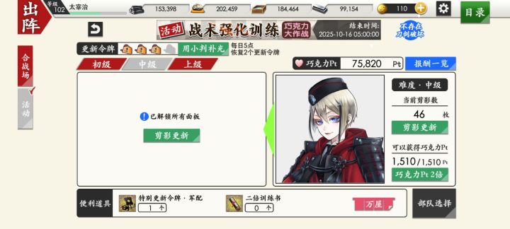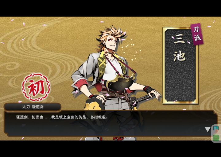 229+169+17=415振,小判耗费约25w,pt63w【新增刀账19(含兑换)】骚速剑,大典太光世,大包平,大般若长光,日本号,小豆长光,日向正宗,南泉一文字,白山吉光,肥前忠广,北谷菜切,笼手切江,桑名江,松井江,治金丸,日光一文字,太阁左文字,五月雨江,大千鸟十文字枪,福岛光忠【总掉落】骚速剑5,大典太光世3,大包平2,大般若长光日本号4,大千鸟十文字枪2,治金丸,北谷菜切白