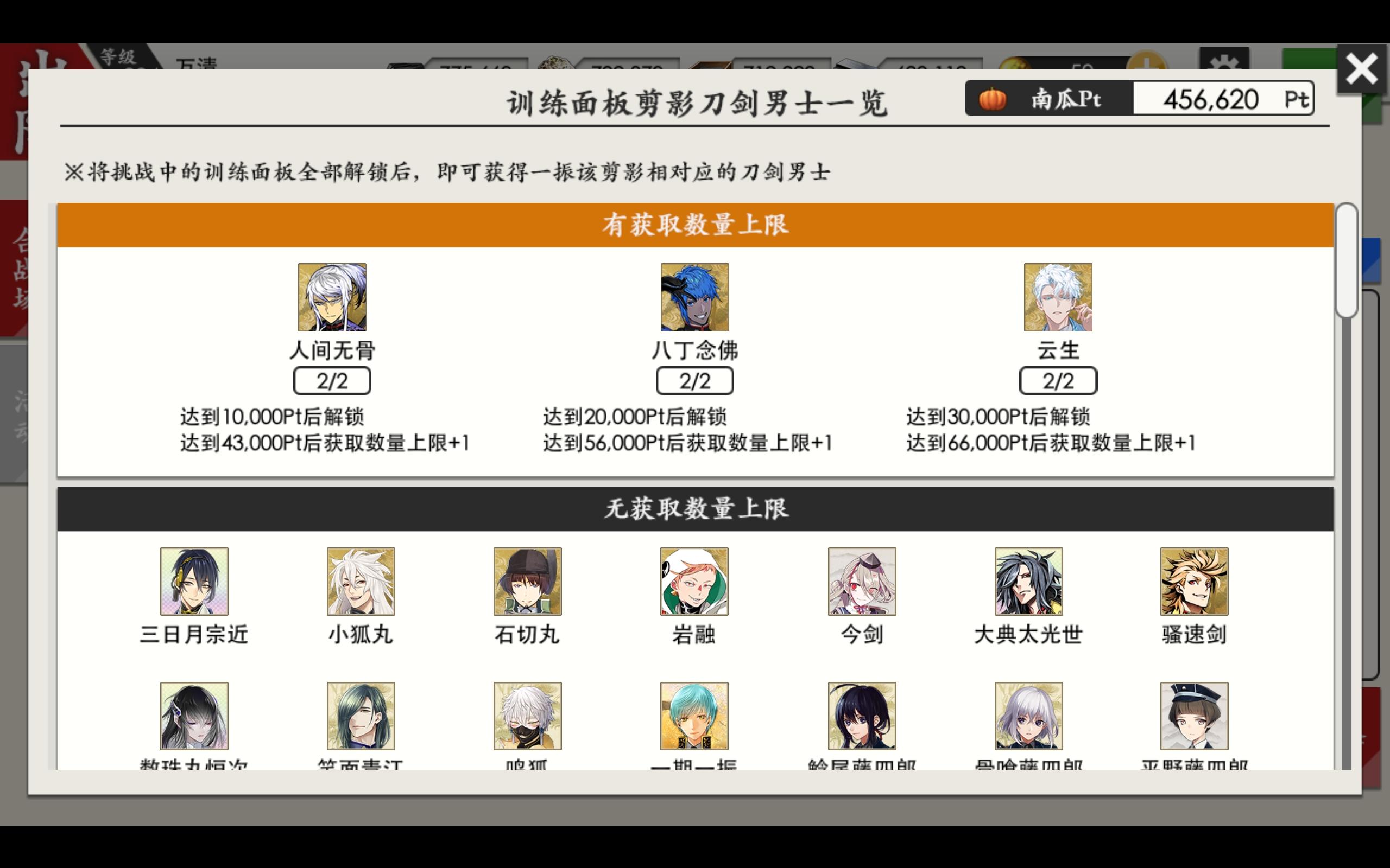 预计打70w小判,留40w地下城挖了好多,只挑出了目前没有满乱的刀刀,红框是新刀泛尘和山姥切听婶婶的话这次一定要主动来好吗〖二编〗掉落总览如图(含活动送的一振云生)新增刀账4:「山姥切长义,八丁念佛,人间无骨,云生」期间新增一队极太,目前刀账118/195这次MVP是小狐丸70wPt时拿齐了6把up,耗费25w小判总共消耗大约77w小判,900振刀,