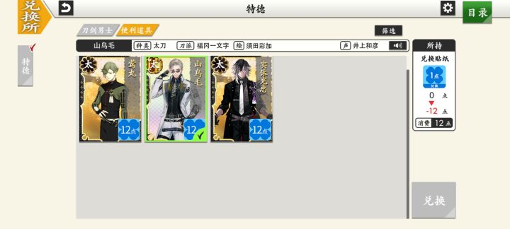 如图所示,山鸟毛我要换一把,实休光忠有一把了,莺丸乱五了,莺丸不打算在兑换所换了,这次兑换所怎么换比较划算。