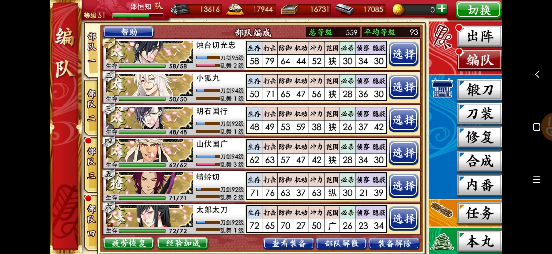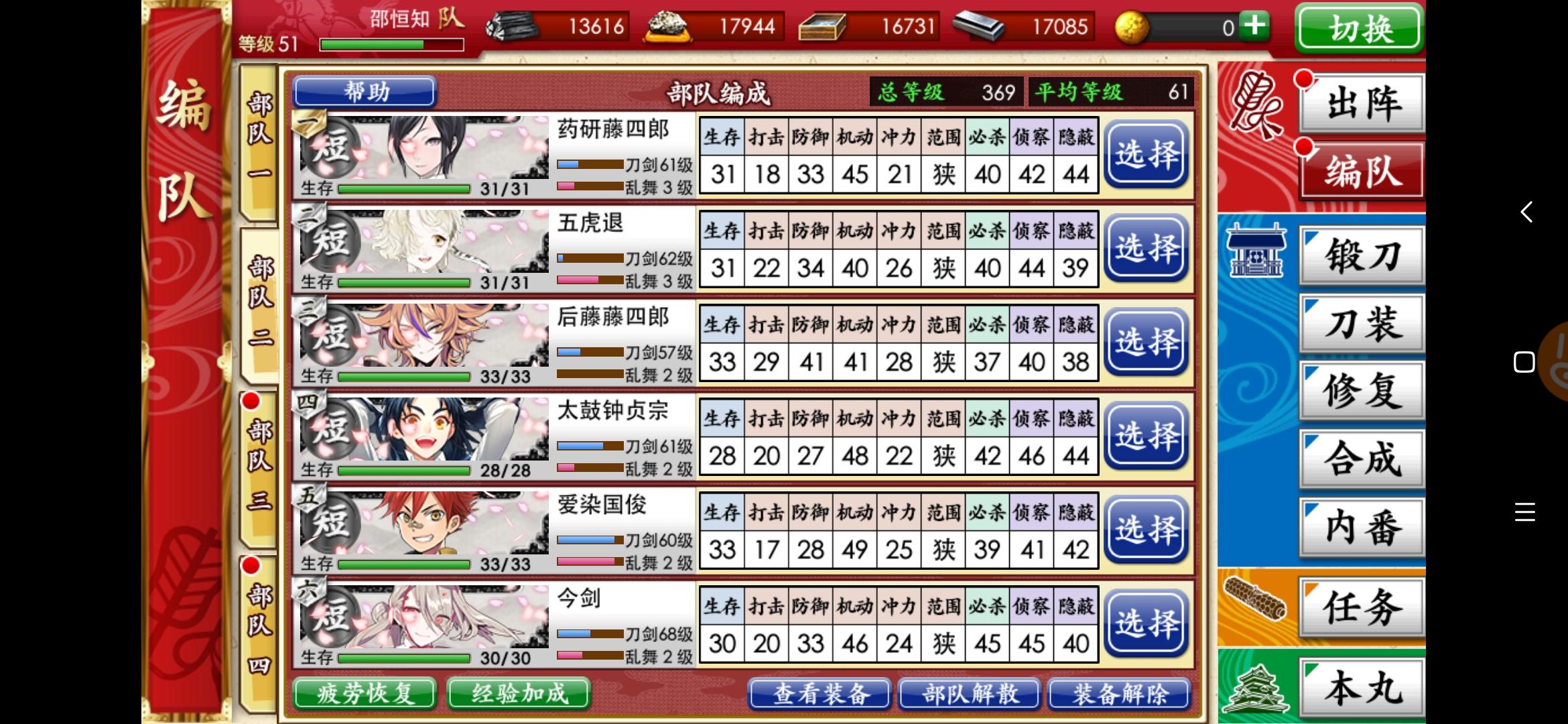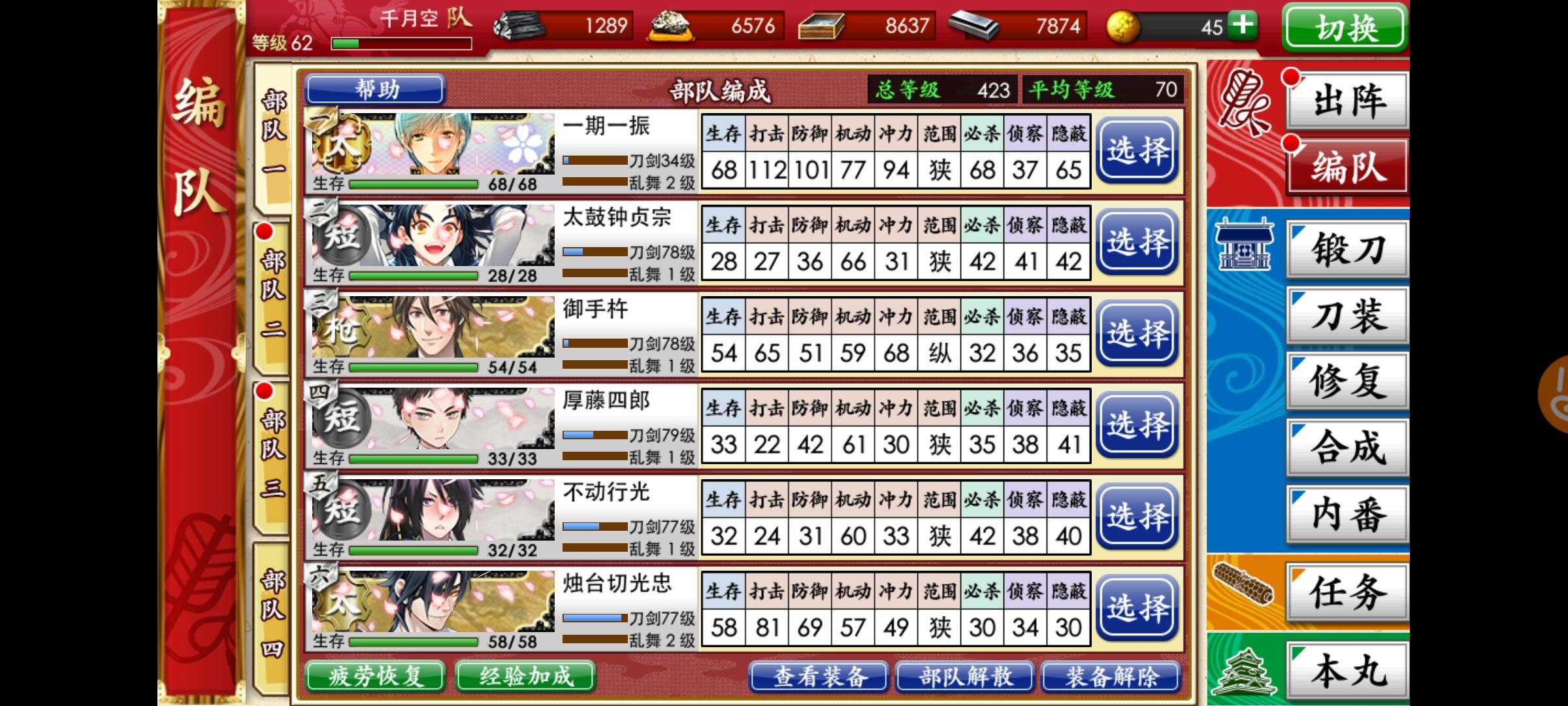 萌新想求助一下7—3什么组合好,我99级有次郎太刀,茧丸,石切丸,江雪,鹤丸,和泉守,太鼓,骨喰,去了三次7图都重伤,已经没材料修刀了,连限锻都停了