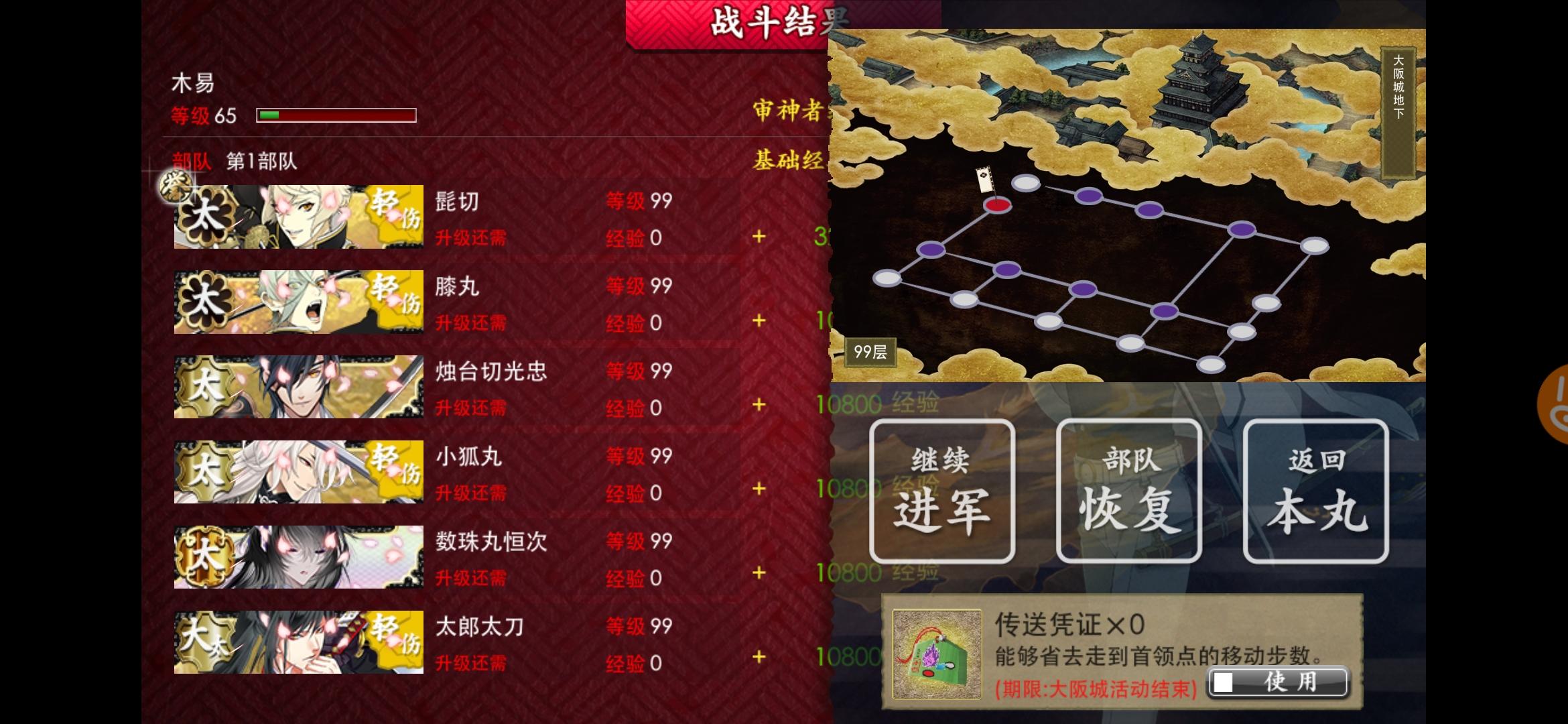 萌新看完攻略后的提问如题,lz最近在打大阪城99,想捞一期一振或者剑,但是只有一个还在修行的极短,练度不太够,所以每次打完都会一堆轻伤(如图)(但是不会掉金蛋和樱吹雪)所以想请问一下,每次刷完一层后,是直接回去加符修复,还是继续刷直到中伤呢(资源如图)