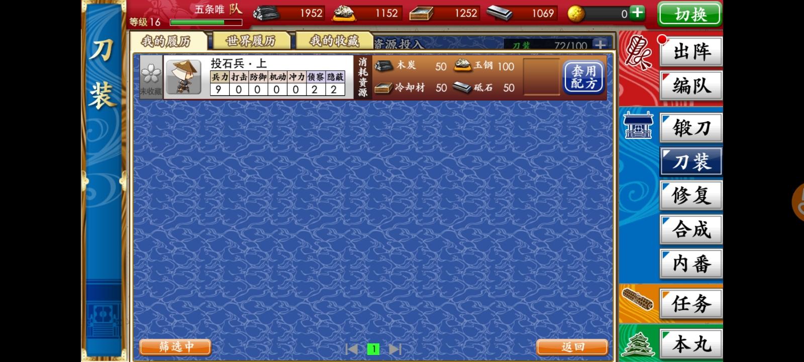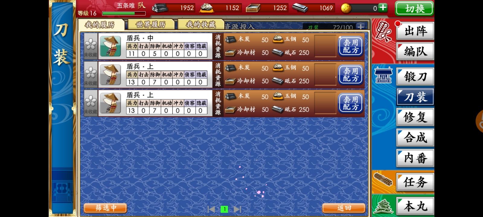 问问44级第一部队等级最高的刀剑85级(被被,因为有活动),等级最低54正常吗。(1队是我练度最高的)。刚才在演练场看见一个等级比我高两级的婶,队里有3个95+。1队等级低是因为打到6图,这几天一直在活地图练短刀(现在一队短刀平均等级45+)。要不要再练一下1队,这样下去演练场都打不过了。还是继续练短刀,等能极化短刀再练1队。