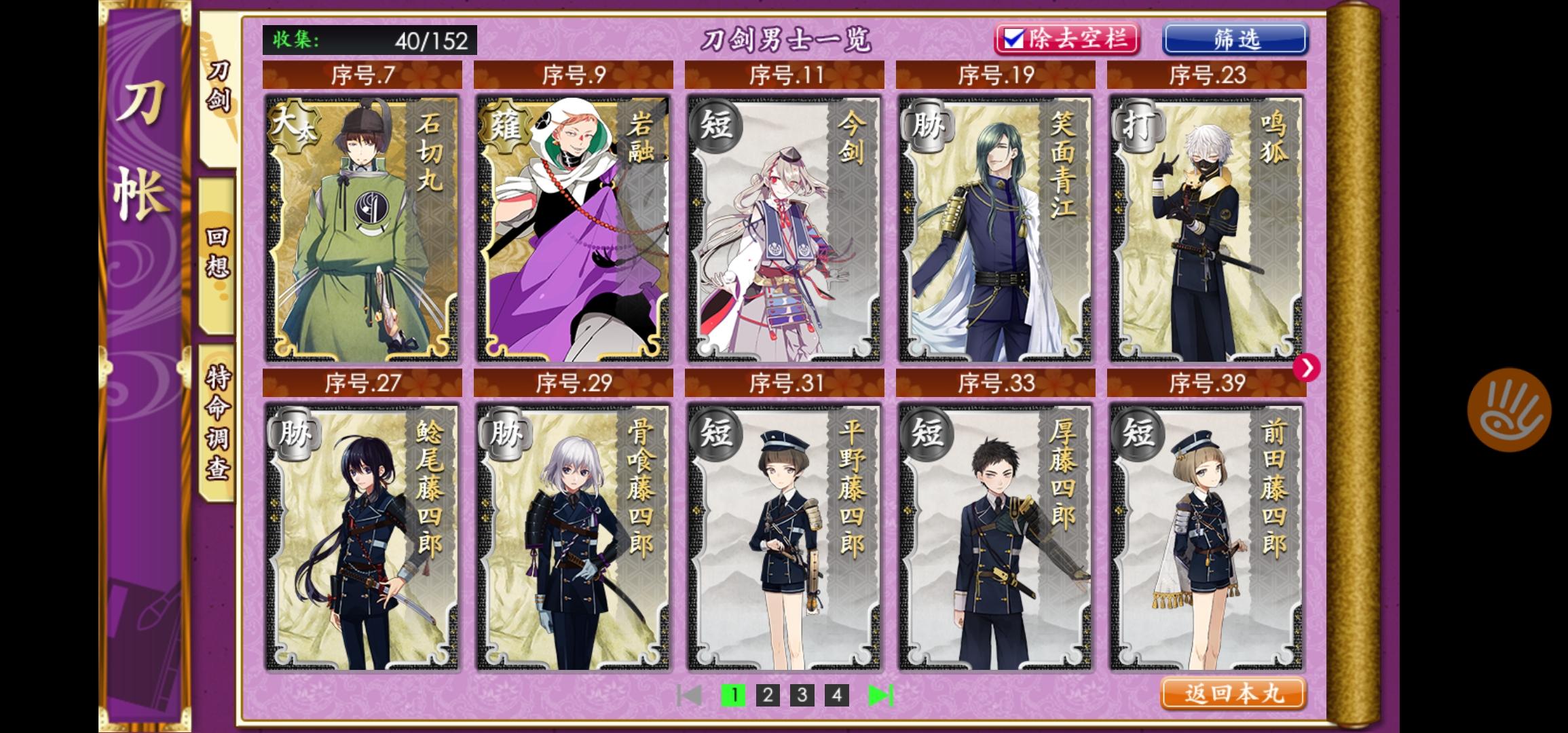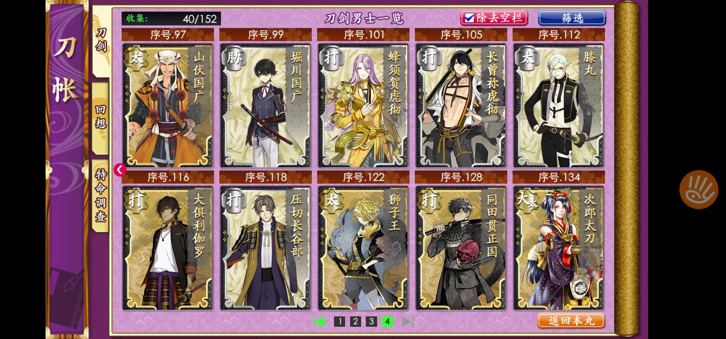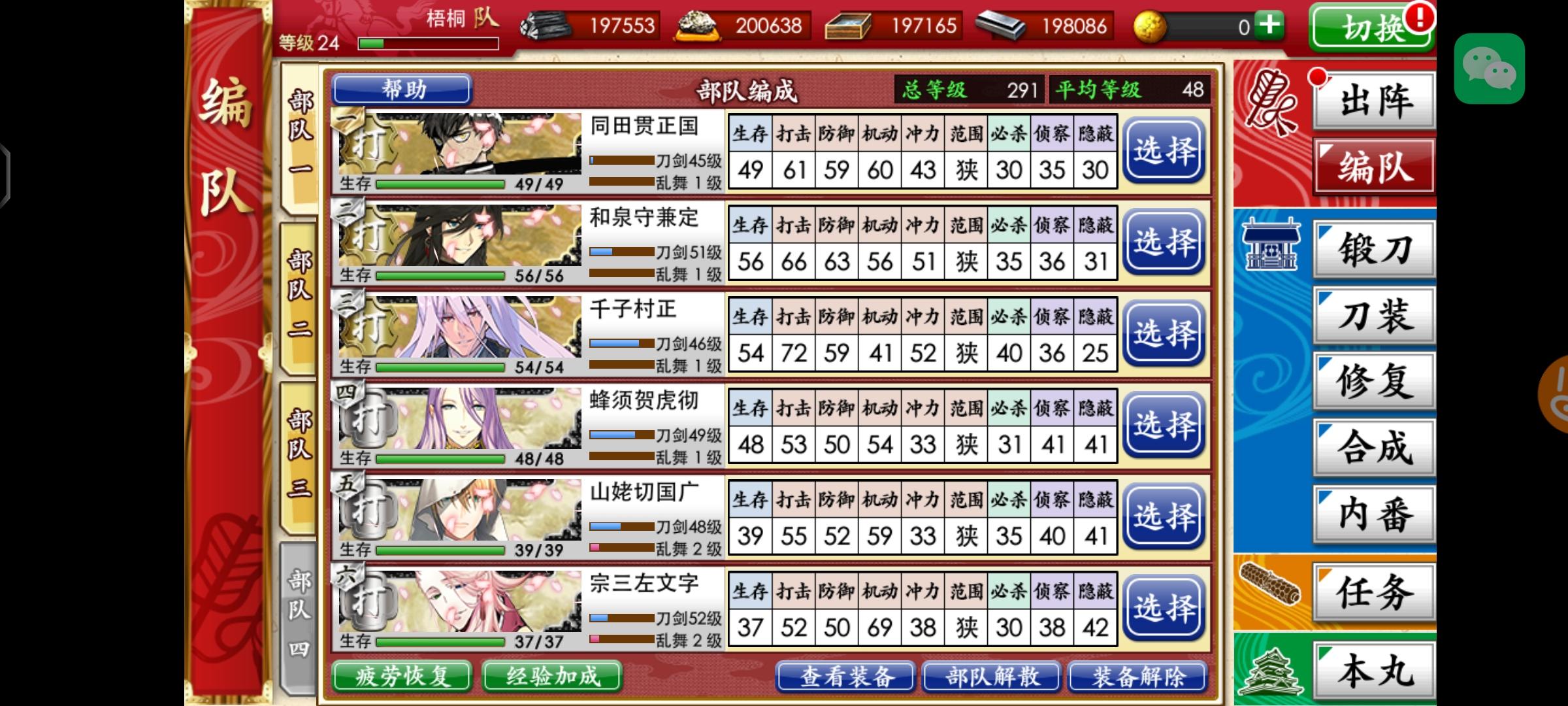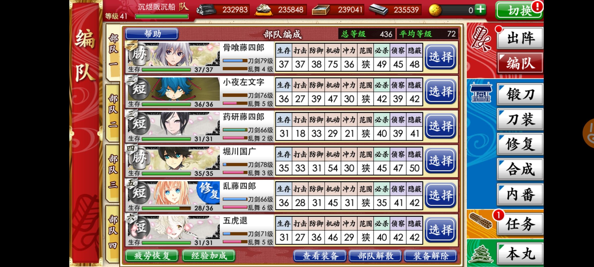 前四张是现在的编队 正在练一队的短刀和胁差,想过池田屋。比较常用的就是一二队,后五张是现在的刀帐。另外刚刚锻到长曾祢虎彻,想知道有没有必要练,还是拖到后面和其他刀子一起随缘按顺序练