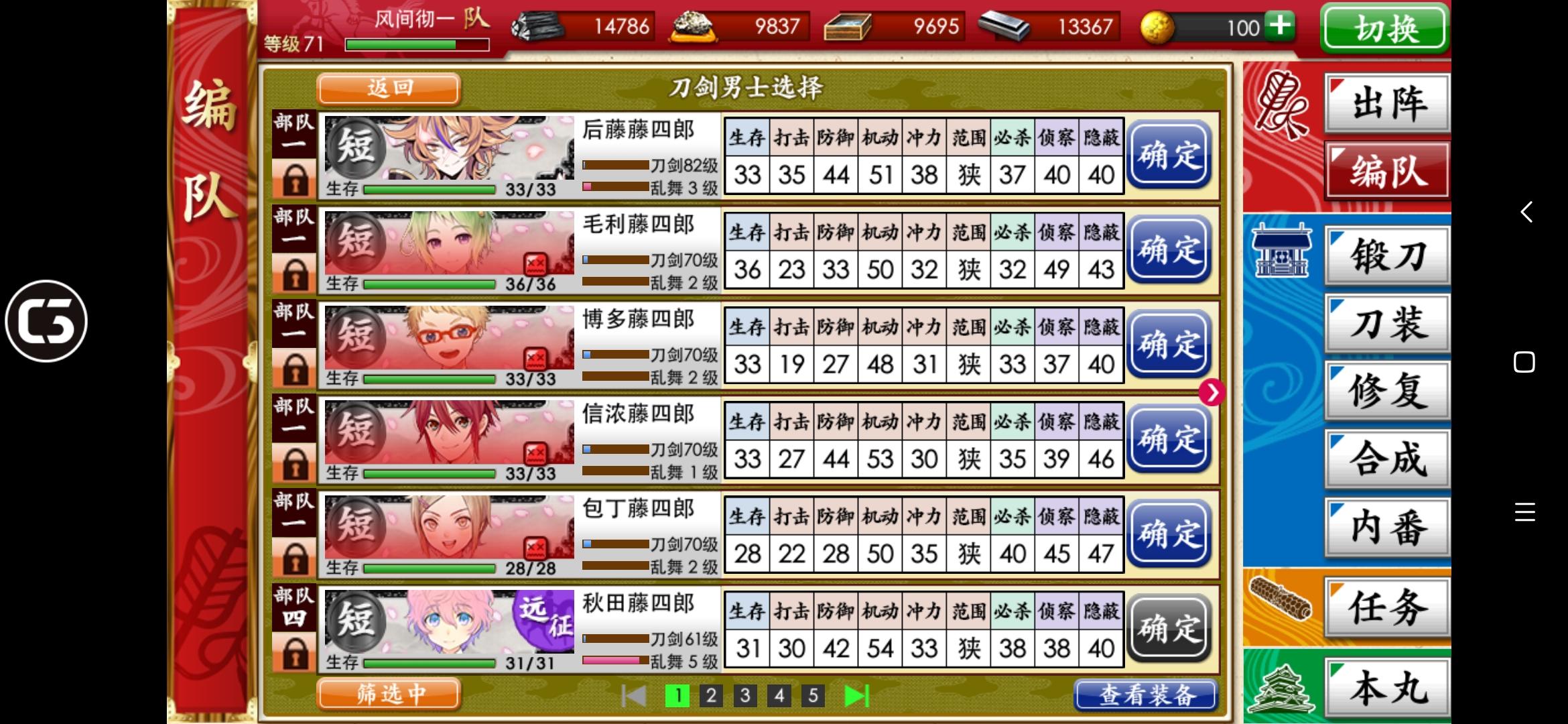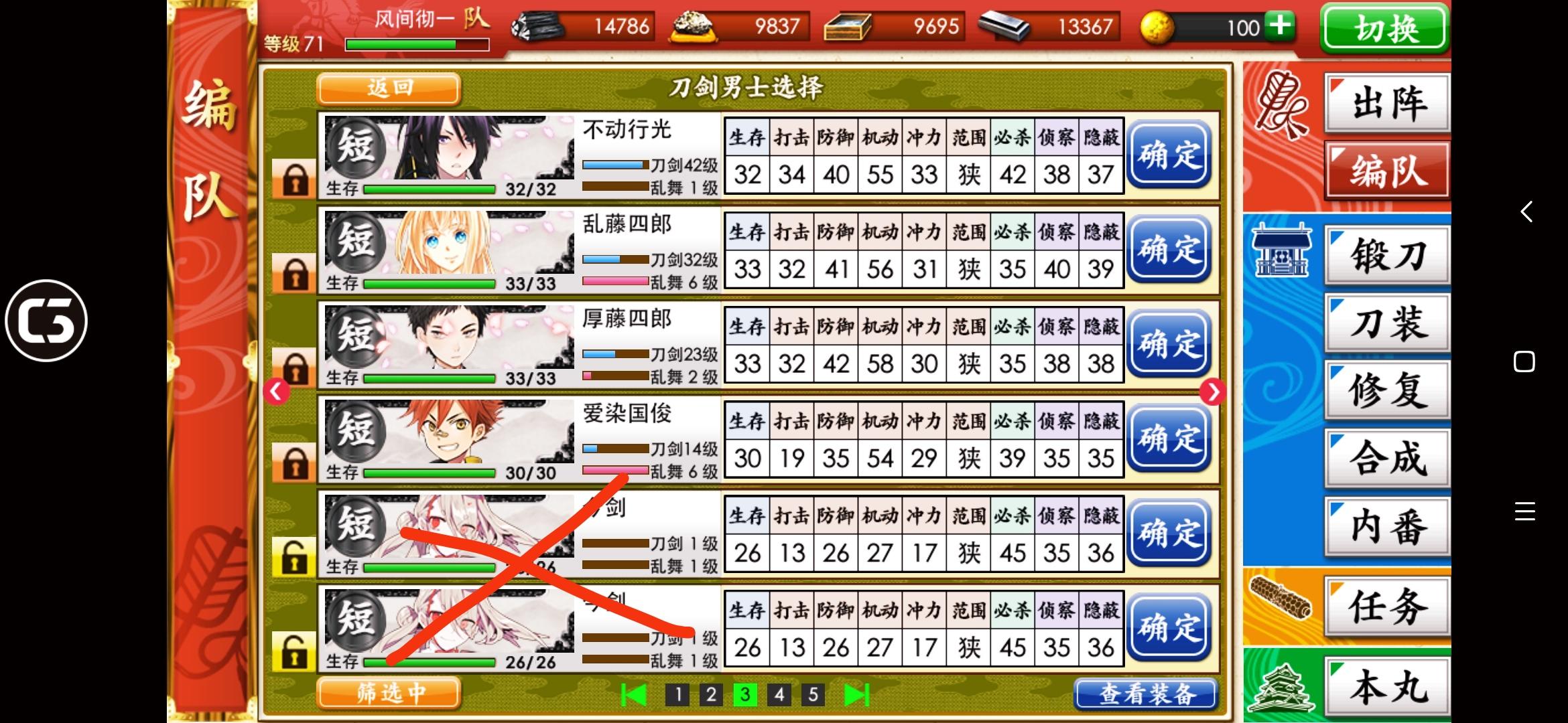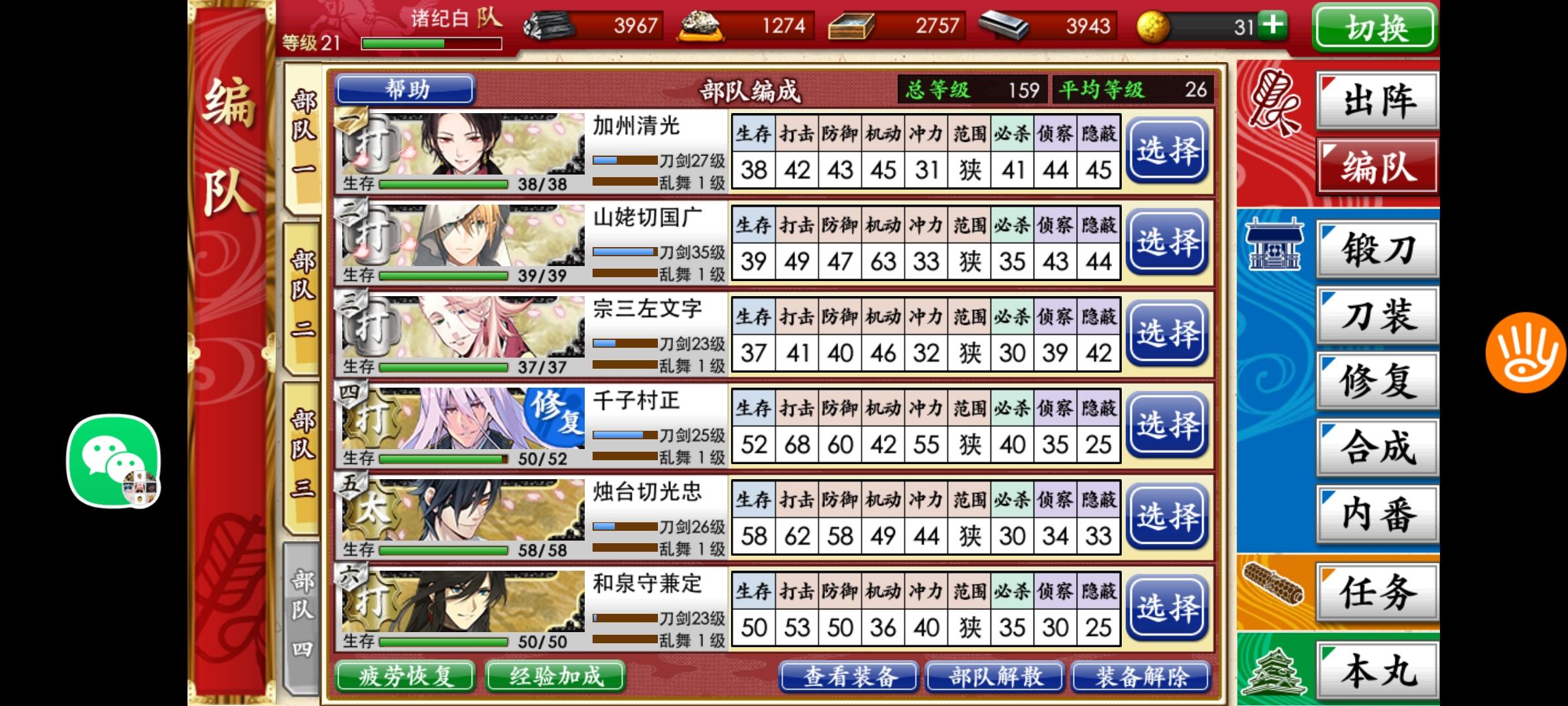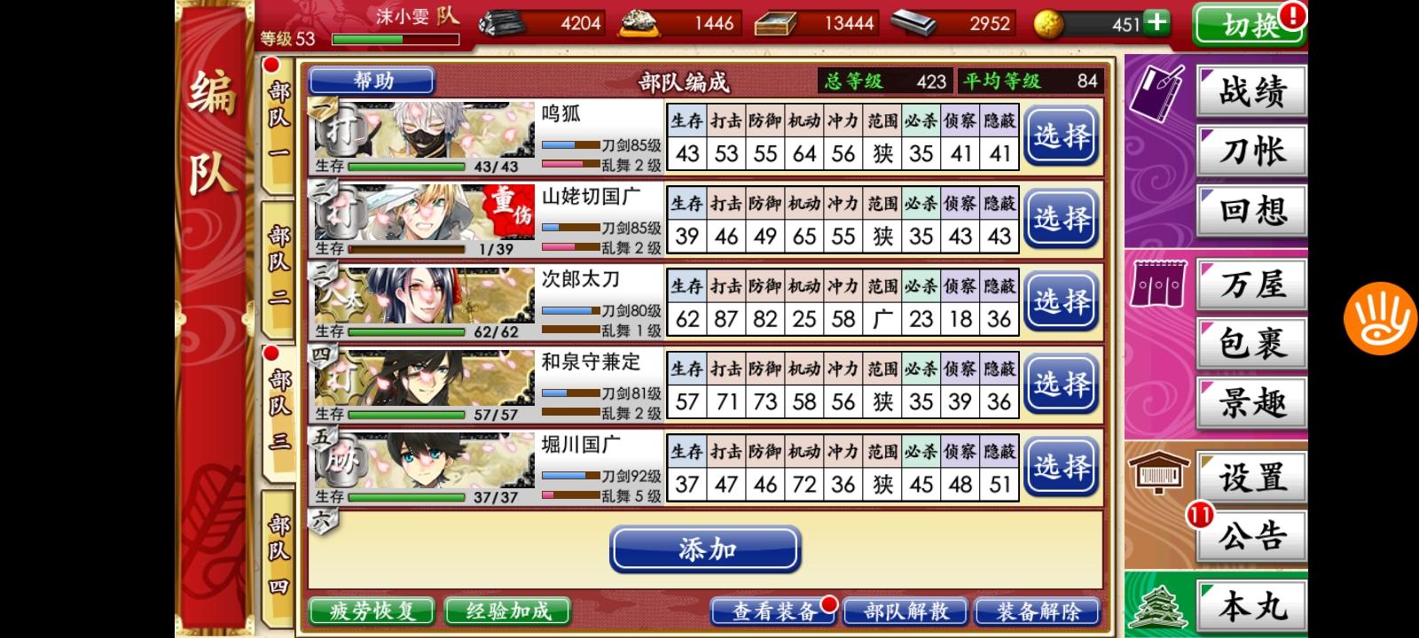 刚打到第四战场,回前面练级的时候遇到检非违使了。一整队被打爆(:з」∠)_我看日课里有战胜检非违使还以为不难打呢,结果一刀一个,我被一刀一个了。这是我目前的第一梯队练度,刚抽到狮子王和巴形,还在练。检非违使在第一战场最后那个,麻了,不敢打了。要多少级才能杀检非违使啊??