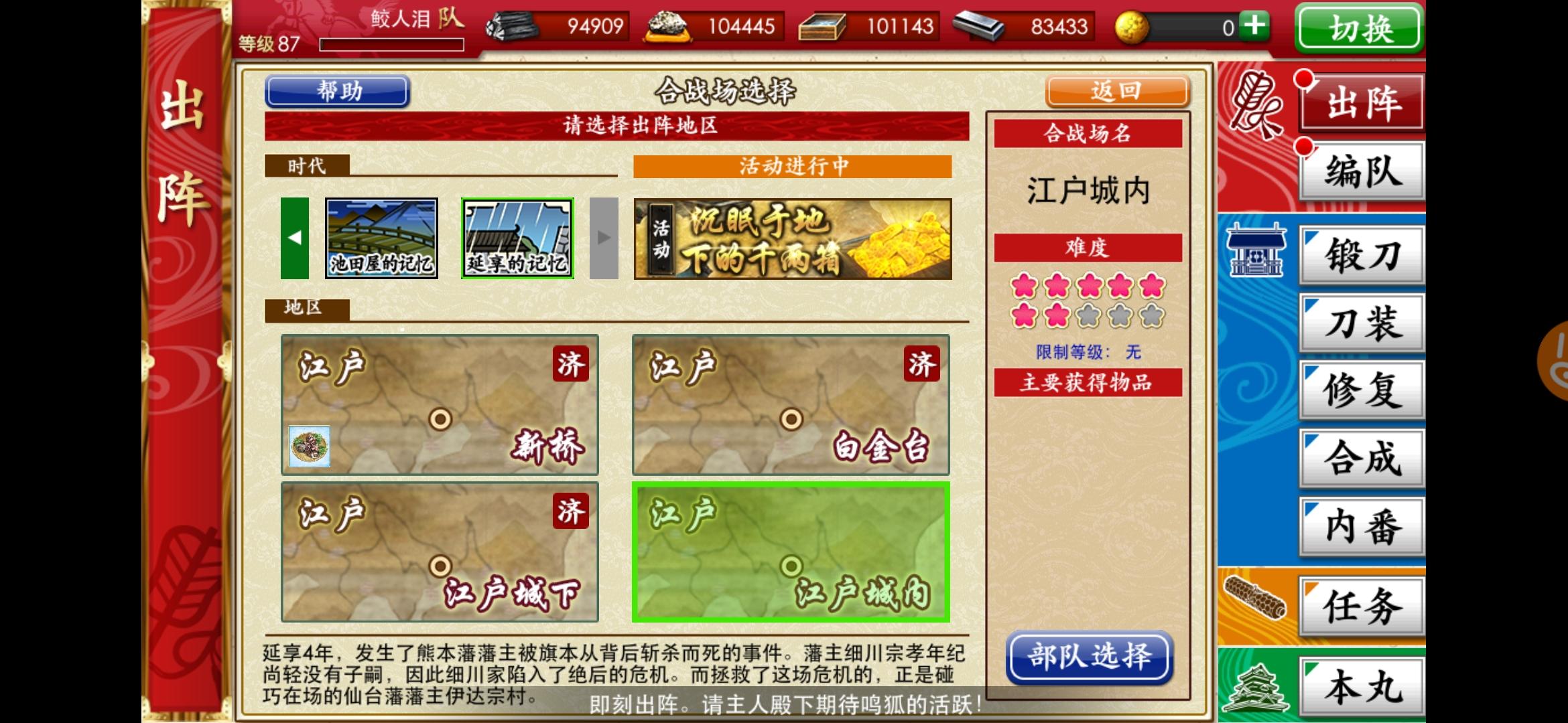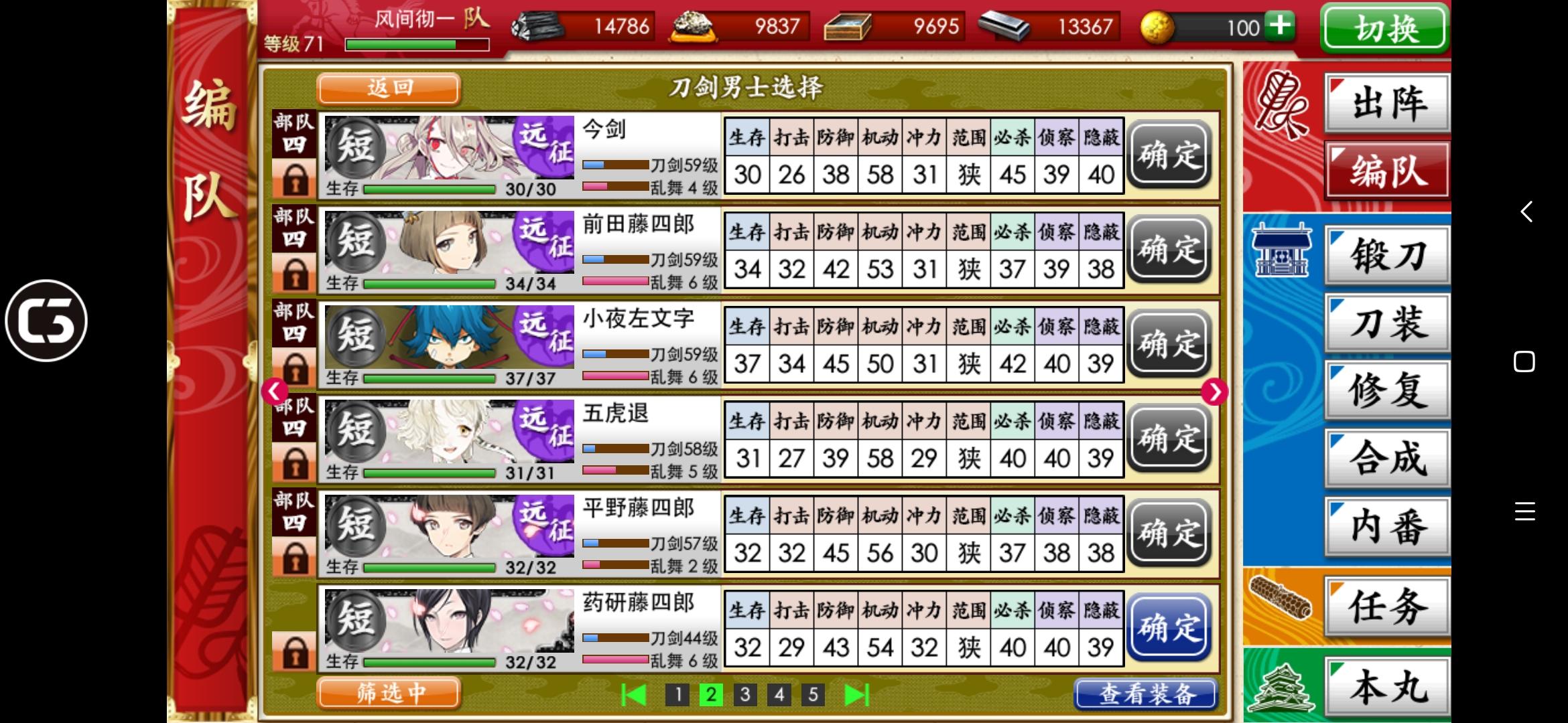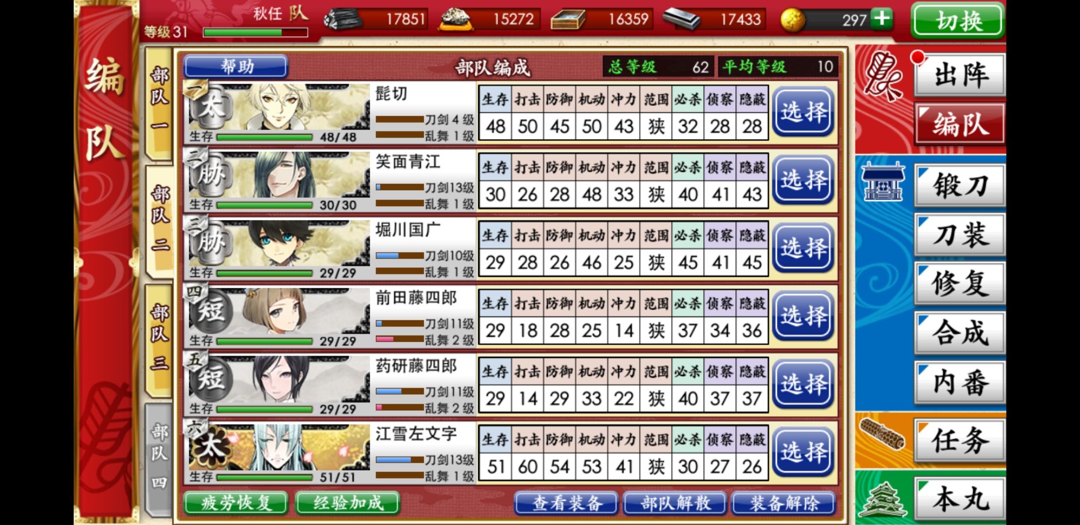 刚打到第四战场,回前面练级的时候遇到检非违使了。一整队被打爆(:з」∠)_我看日课里有战胜检非违使还以为不难打呢,结果一刀一个,我被一刀一个了。这是我目前的第一梯队练度,刚抽到狮子王和巴形,还在练。检非违使在第一战场最后那个,麻了,不敢打了。要多少级才能杀检非违使啊??