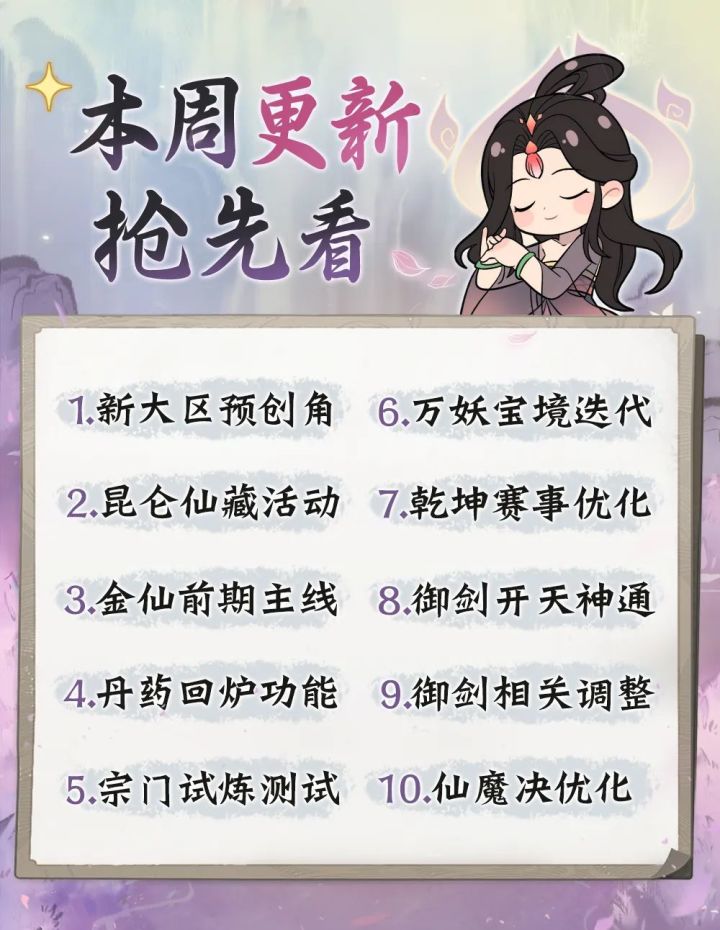 01 新大区预创角新大区【万象千机】4月23日开启预创角同步开启预创充值、预创宗门活动新大区4月26日10点正式开放限定区服可享免费100抽的小师妹赠礼02 昆仑仙藏活动4月12日~16日,在已飞升灵界的位面开启结丹/炼腑/炼意前期及以上修士可参与完成历练任务,获取昆仑遗令和昆仑仙珠开启仙藏可获锻灵神玉、红品古宝碎片等03 金仙前期主线龙脉动荡,星宿逆行,道祖遁世三界安危,