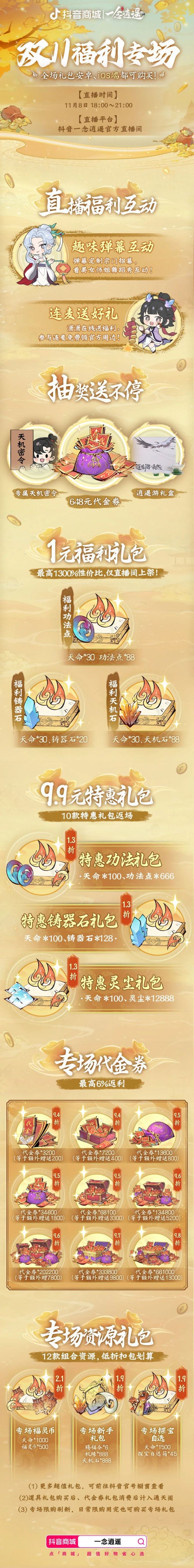 仙长好,小师妹近日见山下街市热闹非凡原来是异界一年一度的“双11”来袭趁此机会,我们也备了丰厚福利送给大家11月8日18:00,抖音福利专场直播开启我们将上架1元福利礼包和专场代金券还有9.9元特惠商品返场,低至1.3折!看直播就送密令,免费抽648元代金券双11专场礼包售卖时间为11月8日18:00-14日21:00,1元福利礼包仅在直播间上架。打开抖音扫描下方二维码,即可前往预约