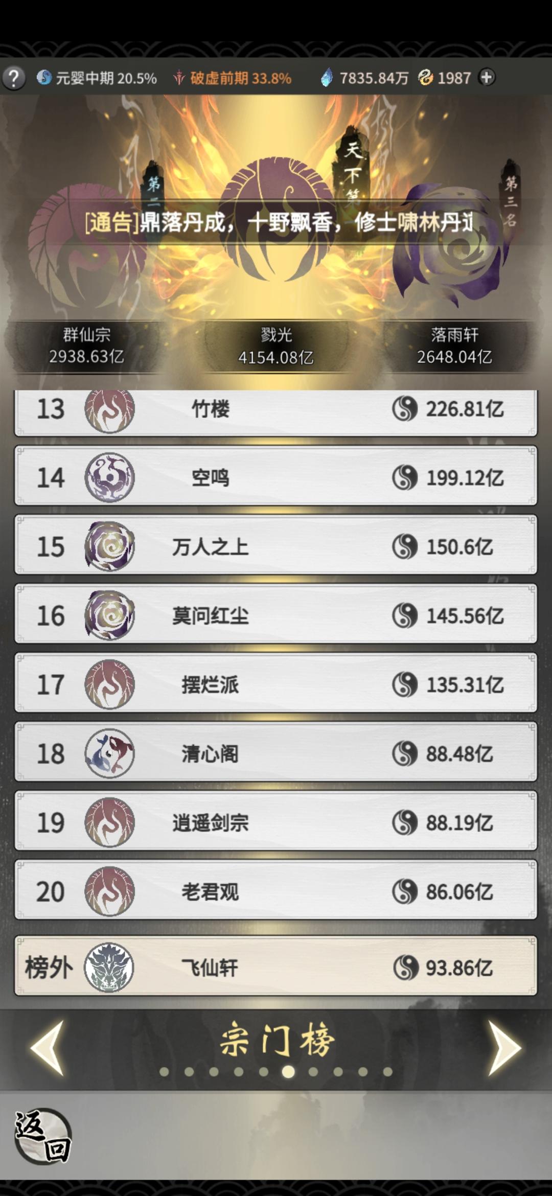 我们会在9月26号(星期一)早上10点开灵界,灵界开的当天已圆满修士或者未圆满准备飞升的修士(建议在后期70%以上存够100颗药的飞)当天的丹药和吐呐次数一定要用完,飞升上去会刷新,每日活跃度的几个箱子不要领取,等到灵界会刷新里面的东西,上去优先开第二个图吃香(人界记得存点香)然后挂机在第二图,然后记得打困魔塔(人界锁妖塔)会掉落星尘的。