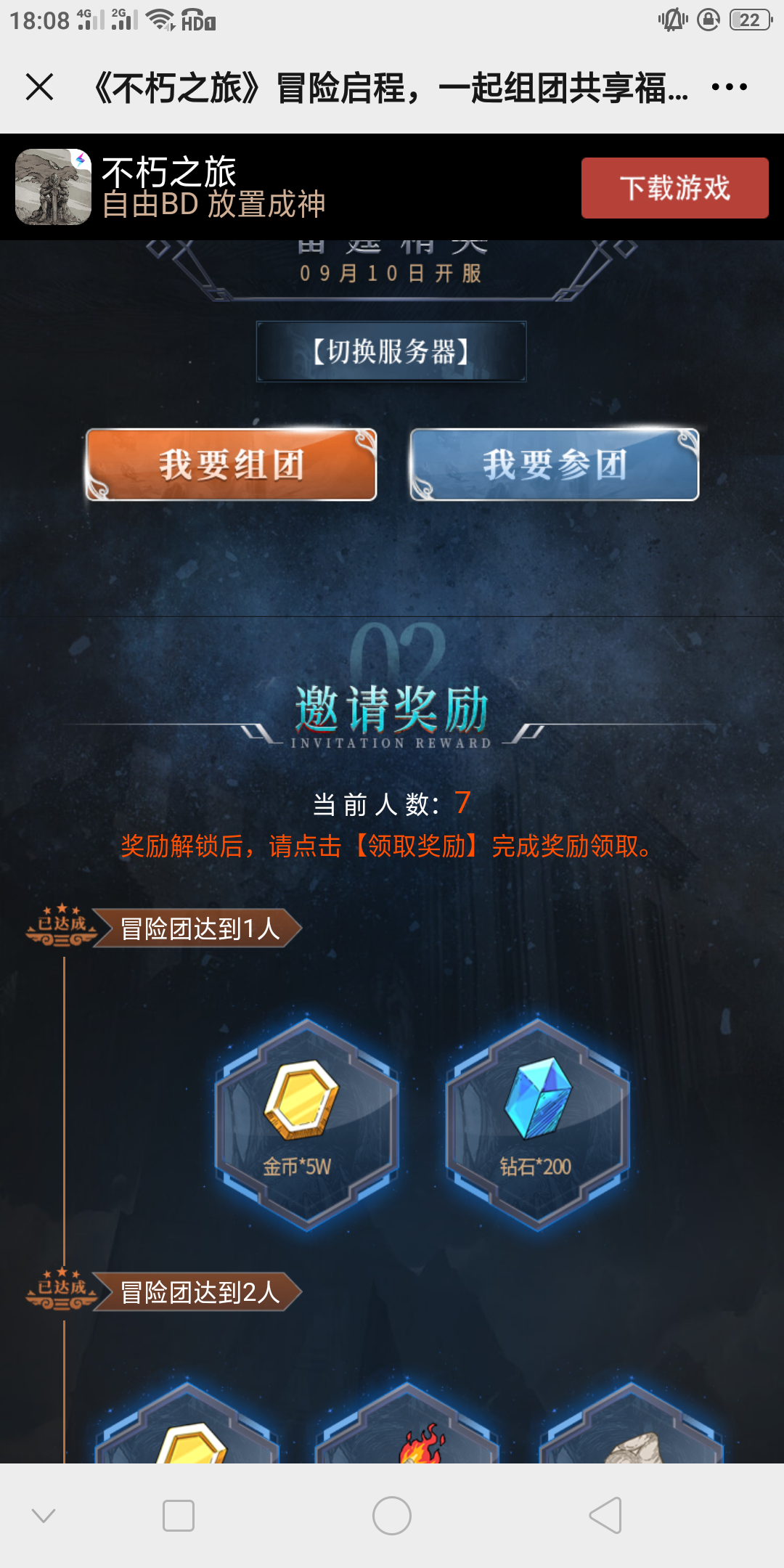 2区的组团来呀城郊荒野冒险启程!快加入我们冒险团,一起共享成团福利吧: https://activity.leiting.com/bxzl/202010/invite/?id=153g89